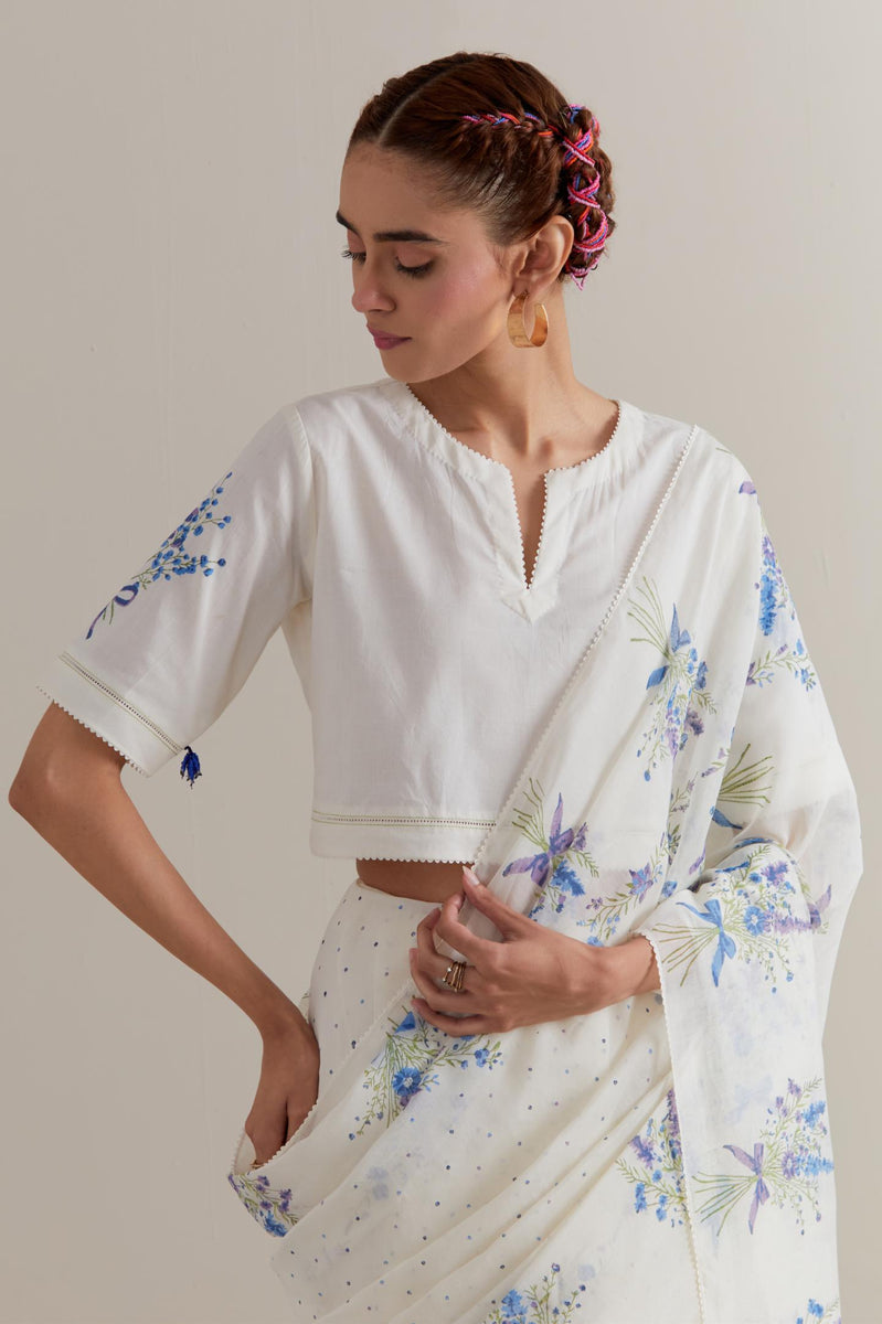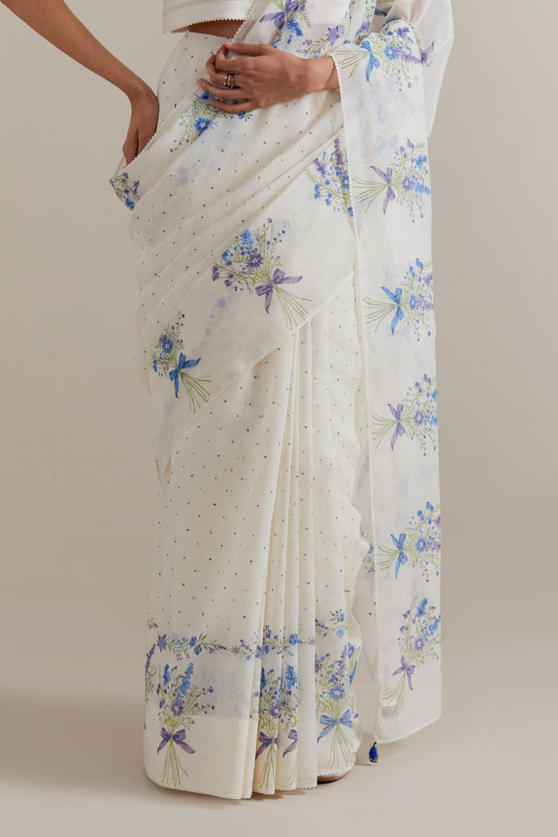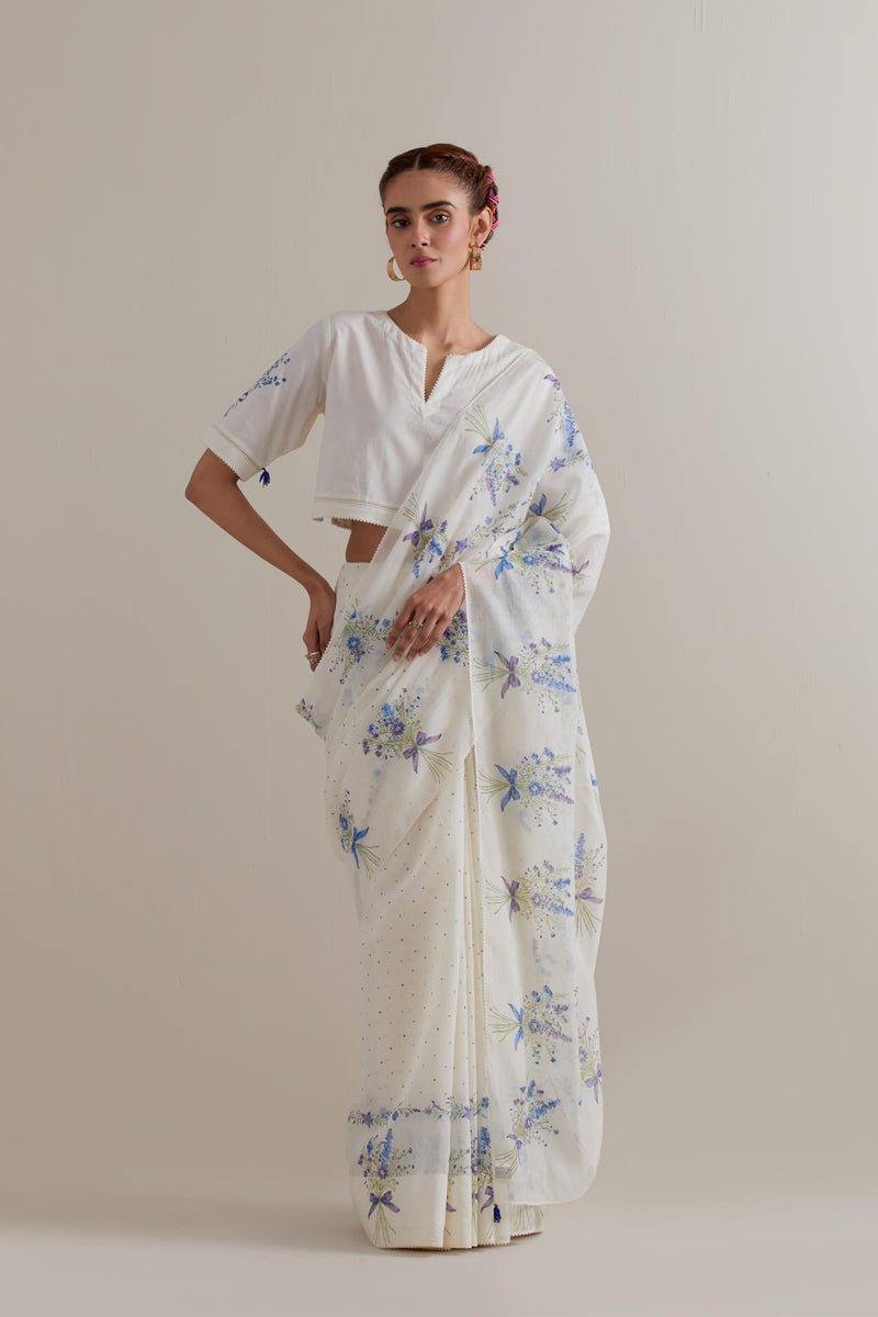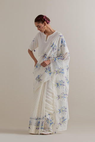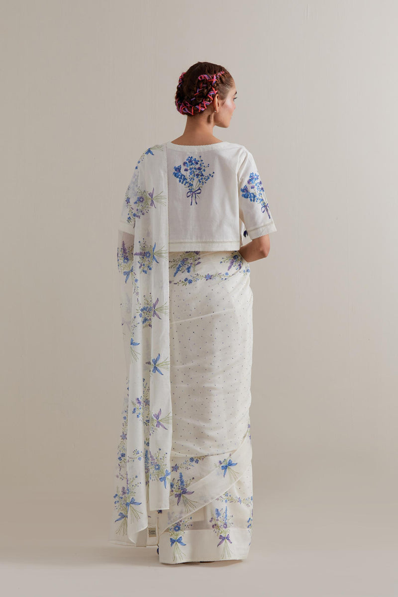 Off-white Chanderi cotton saree with all-over blue-and-green floral hand block printed bootas on the sides and small polka dots throughout. The edges of the saree are finished with ricrac. The corners of the saree pallu have beaded tassels. Paired with Off-white cotton blouse with Blue & green floral hand block printed boota at sleeves and back. The edges of sleeves, neck, side slits and hem are finished with ricrac.