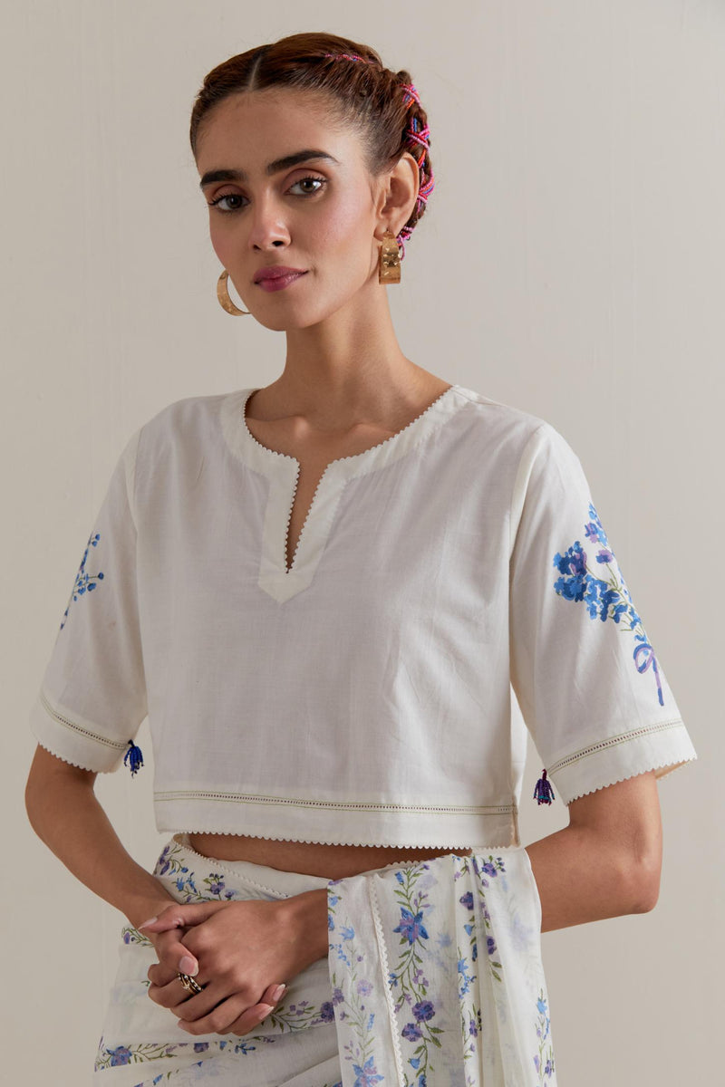 Off-white cotton blouse with Blue & green floral hand block printed boota at sleeves and back. The edges of sleeves, neck, side slits and hem are finished with ricrac.