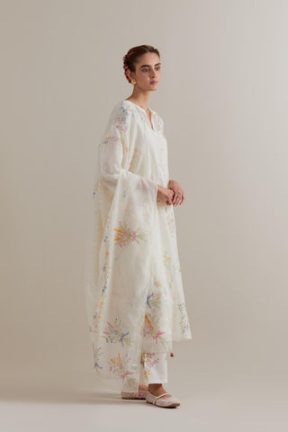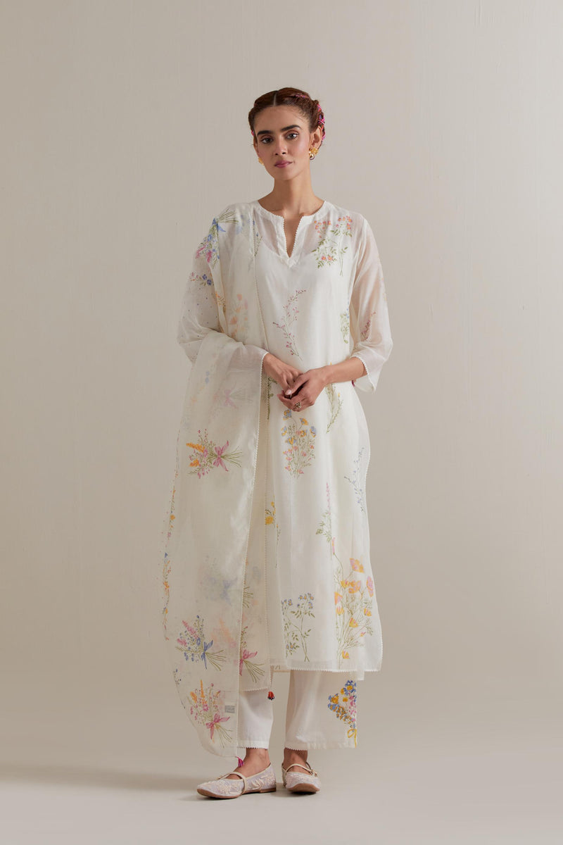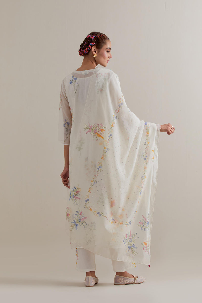 Off white cotton chanderi dupatta with all-over multi floral hand block print. The edges of the dupatta are finished with ricrac. The corners of the dupatta have beaded tassels.