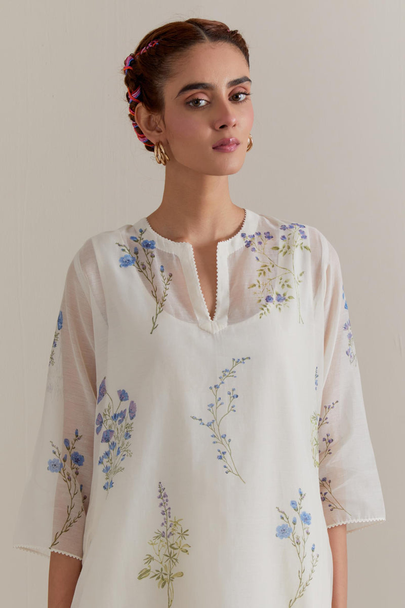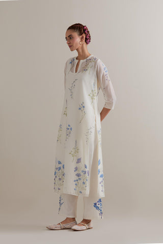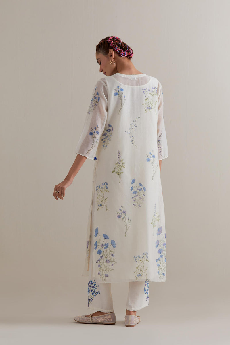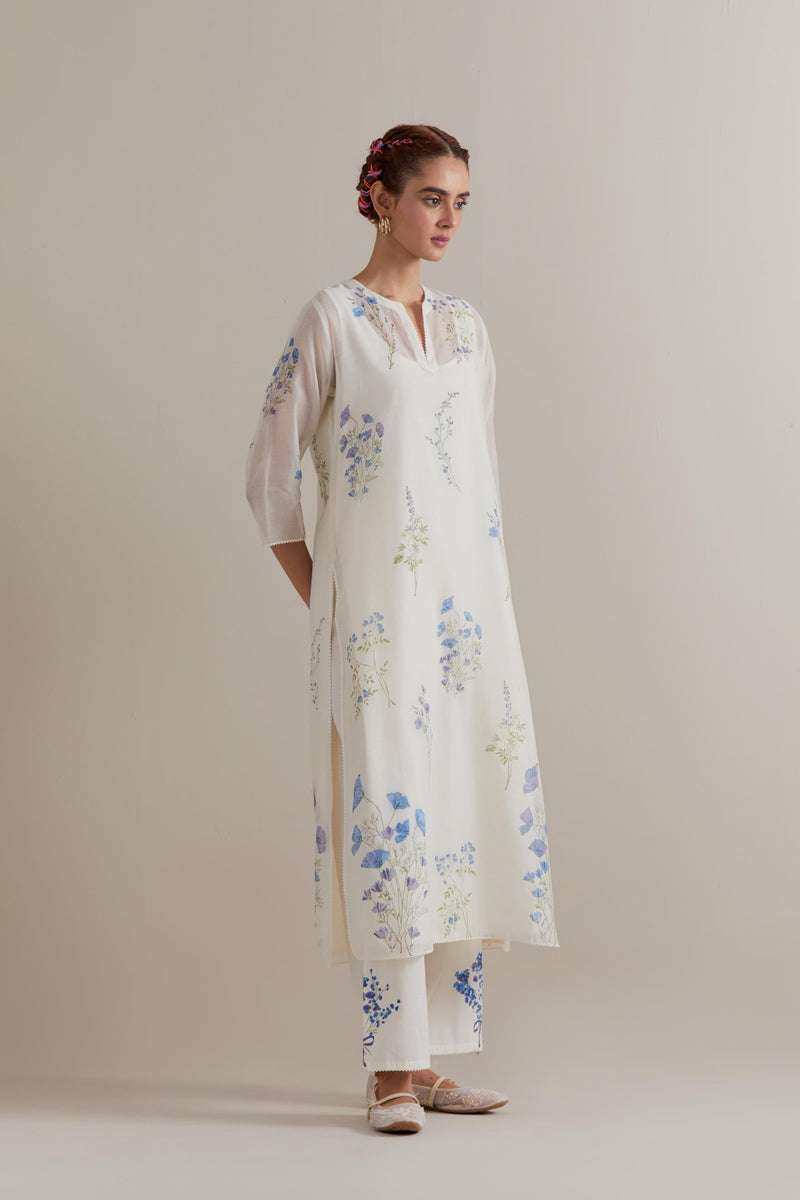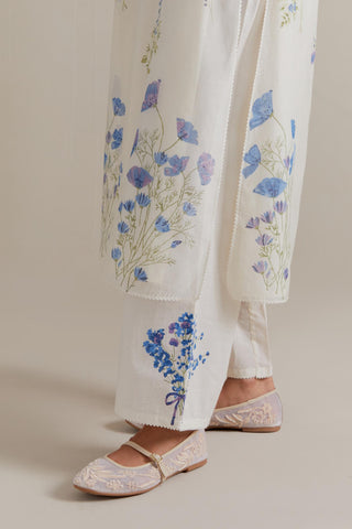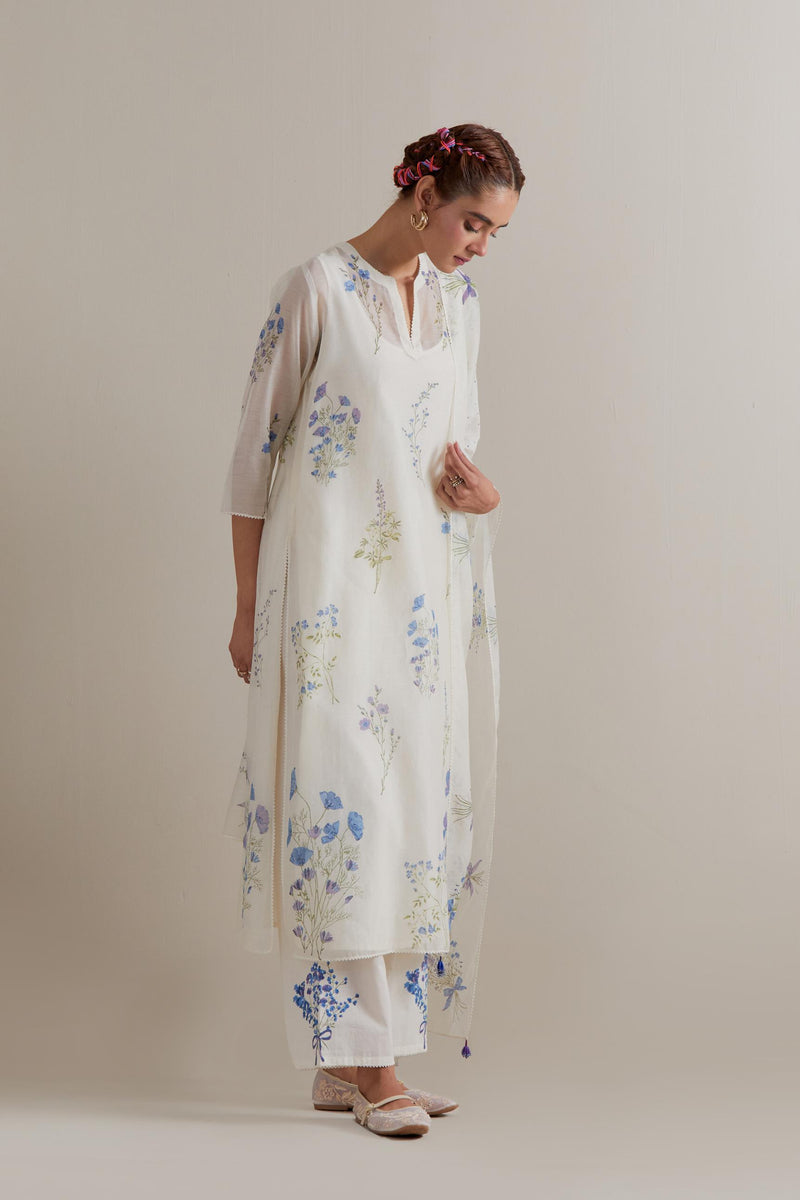 Off white cotton chanderi hand block printed kurta with all-over Blue and green coloured flower. It has round neck with slit in the front. The edges of 3/4 sleeves, neck, side slits and hem are finished with ricrac. Worn with a cotton slip. Paired with Off white cotton straight pants with Blue and green floral hand block printed boota at sides. It has side pockets and an elasticated waist band with drawstrings in the front for a better fit. Comes with Off white cotton chanderi dupatta with all-over Blue & green floral hand block print. The edges of the dupatta are finished with ricrac. The corners of the dupatta have beaded tassels.