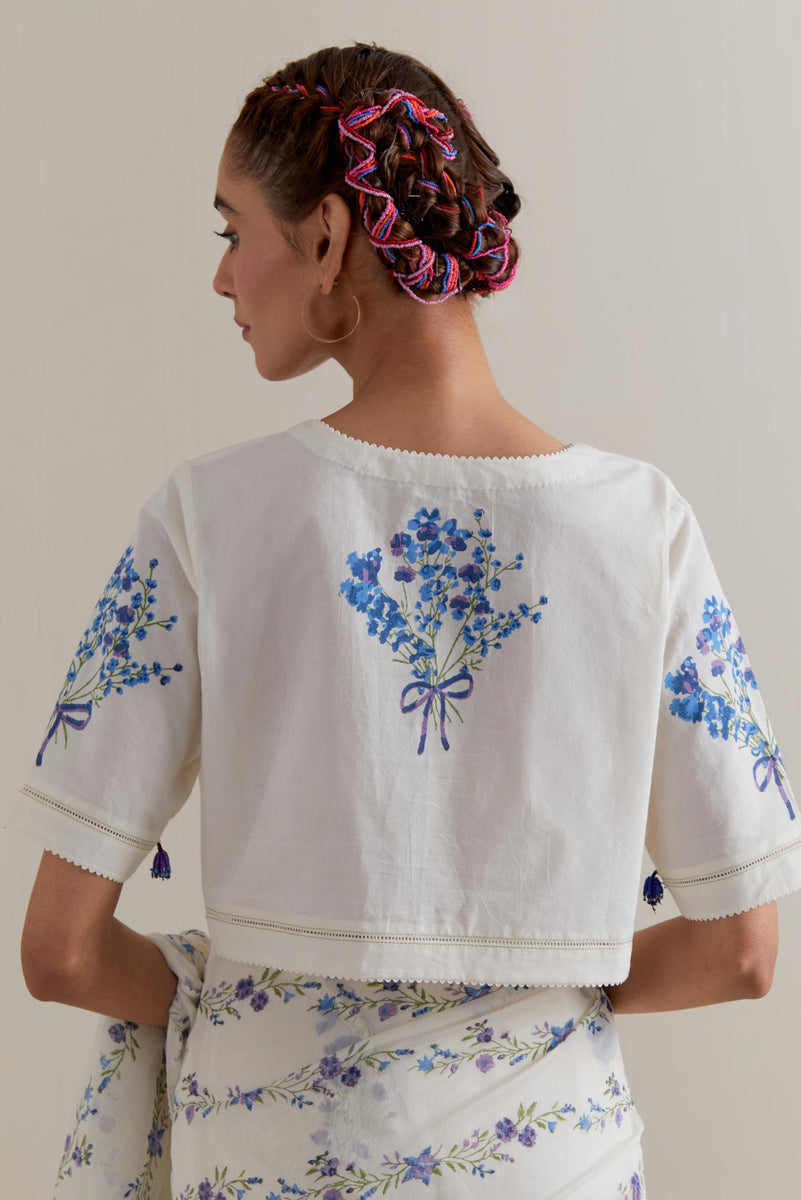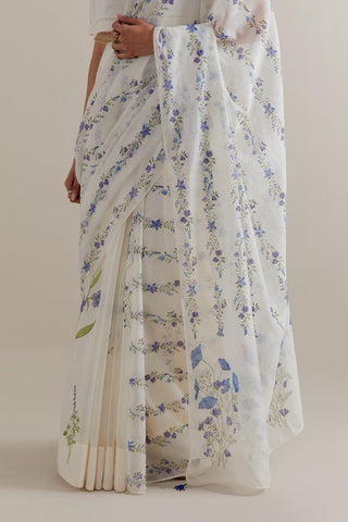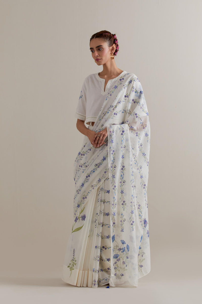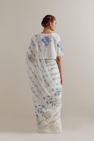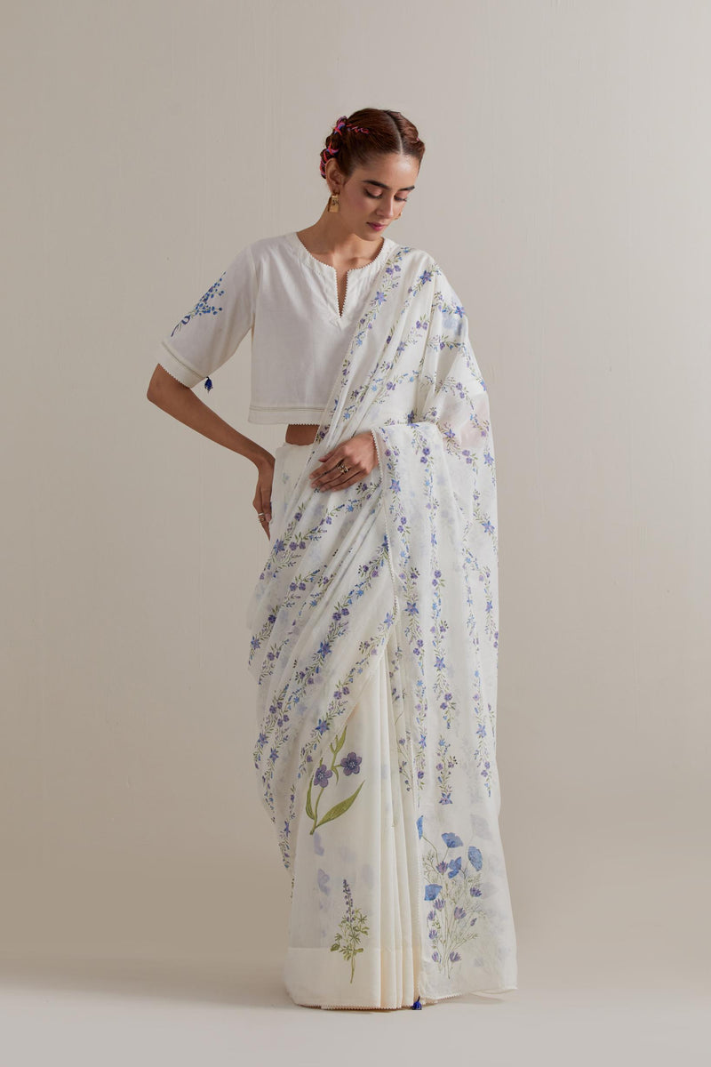 Off white cotton chanderi saree, highlighted with all-over Blue & green floral hand block print. The edges of the saree are finished with ricrac. The corners of the saree pallu have beaded tassels. Paired with Off-white cotton blouse with Blue & green floral hand block printed boota at sleeves and back. The edges of sleeves, neck, side slits and hem are finished with ricrac.