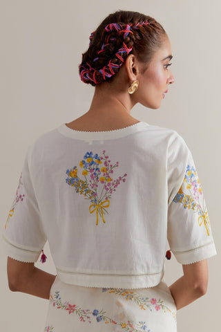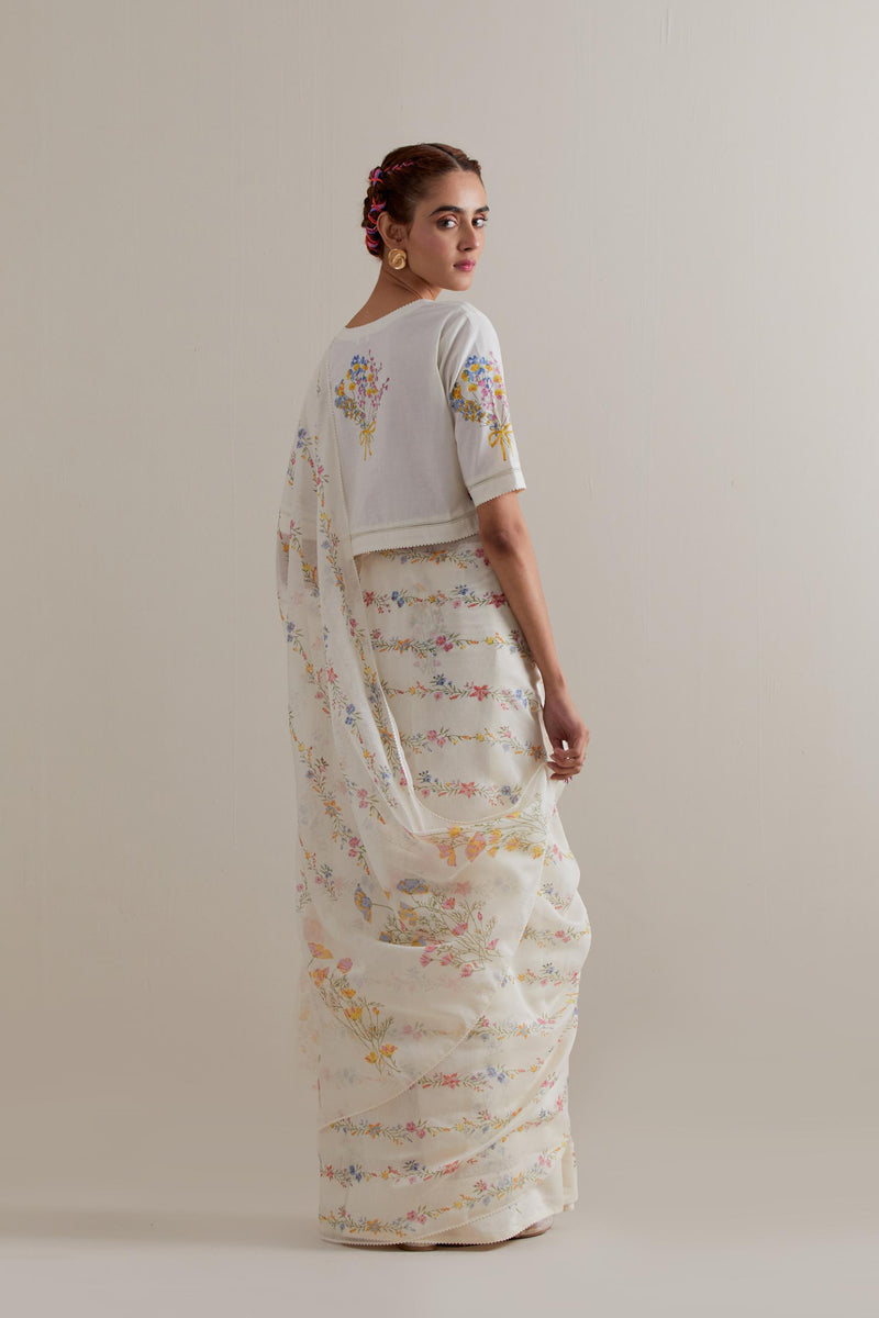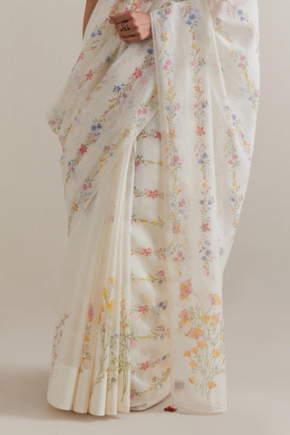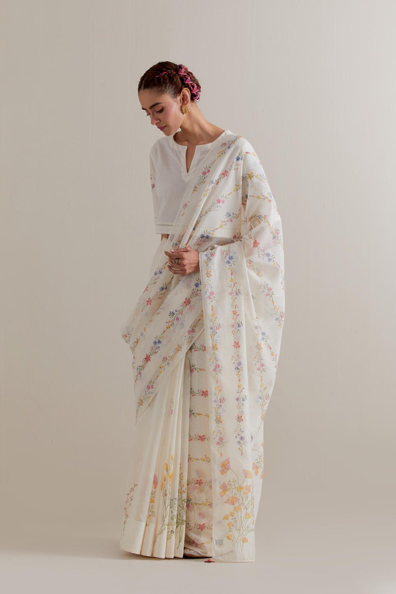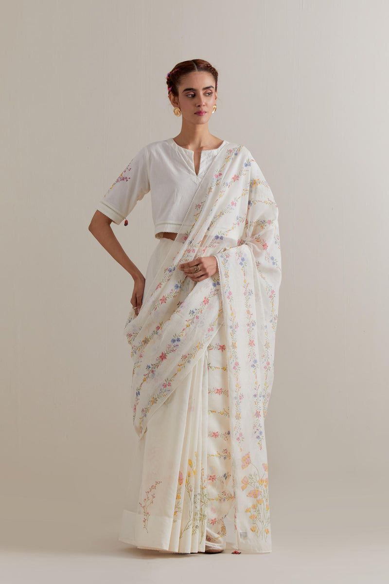 Off white cotton chanderi saree, highlighted with all-over multi coloured floral hand block print. The edges of the saree are finished with ricrac. The corners of the saree pallu have beaded tassels. Paired with Off-white cotton blouse with multi coloured floral hand block printed boota at sleeves and back. The edges of sleeves, neck, side slits and hem are finished with ricrac.