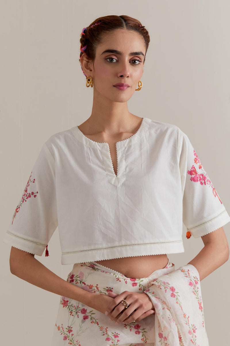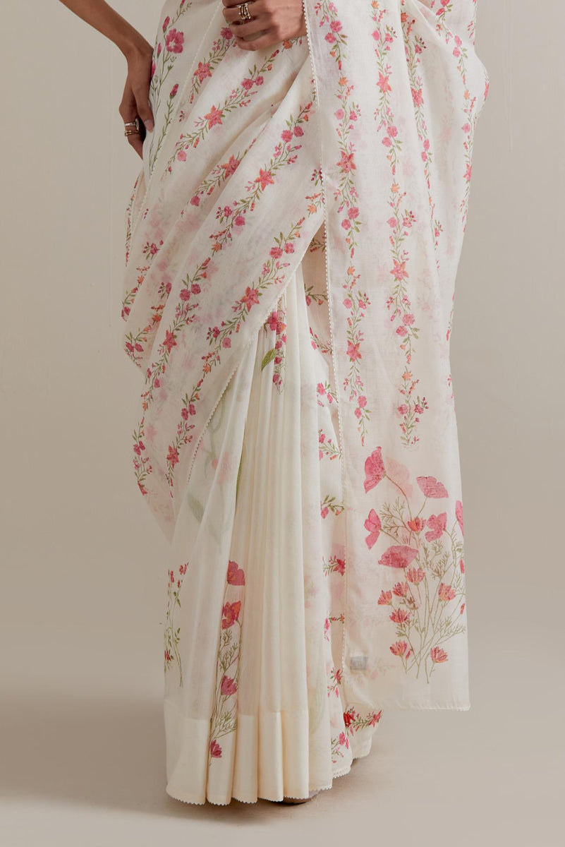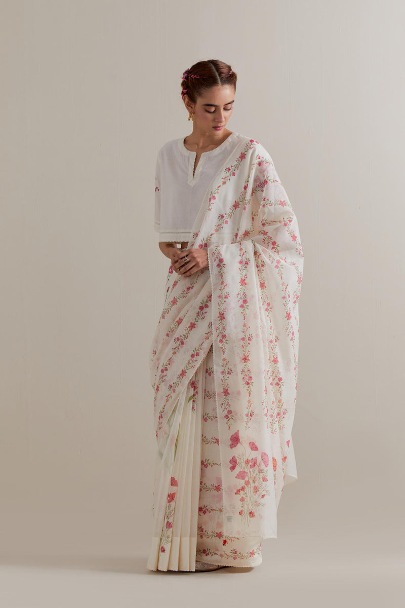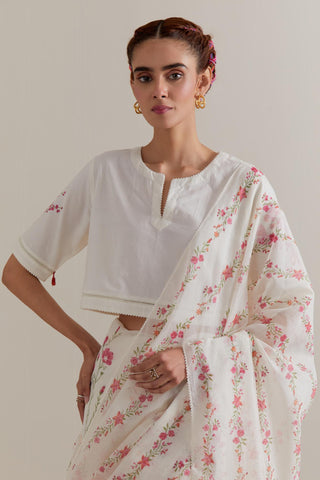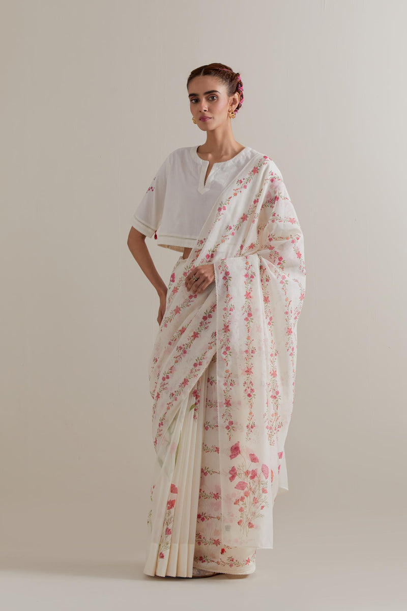 Off white cotton chanderi saree, highlighted with all-over Pink & green floral hand block print. The edges of the saree are finished with ricrac. The corners of the saree pallu have beaded tassels. Paired with Off-white cotton blouse with Pink & green floral hand block printed boota at sleeves and back. The edges of sleeves, neck, side slits and hem are finished with ricrac.