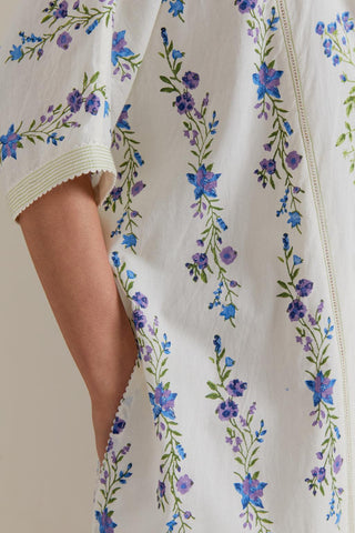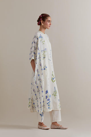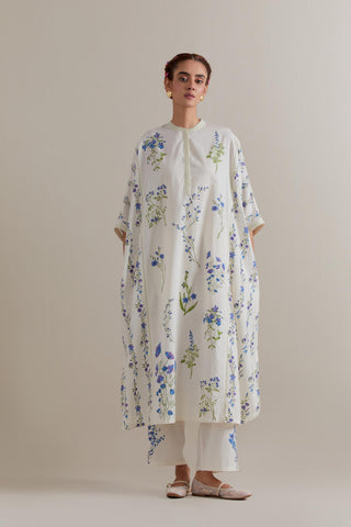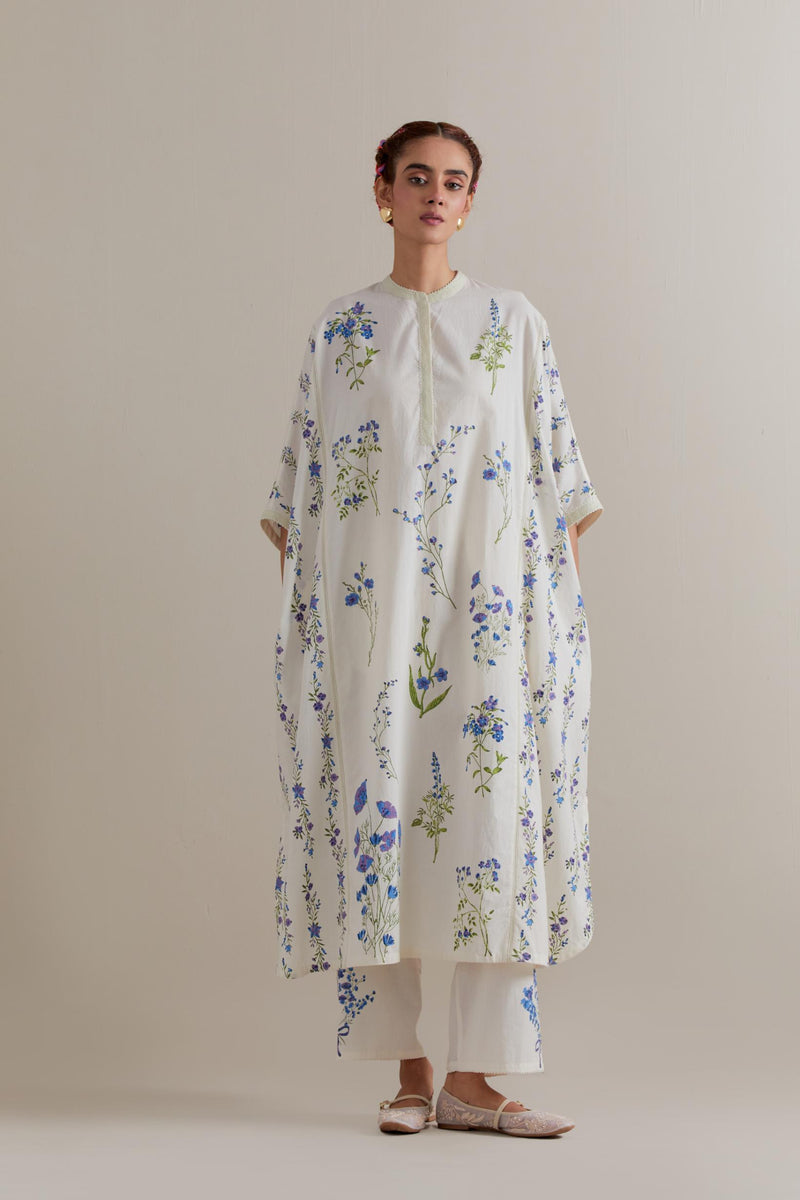 Off white cotton easy fit kaftan with all-over Blue & green coloured flower hand block print, highlighted with ladder lace at sides panels. It has a round neck with a button placket in the front. The edges of sides, neck, and hem are finished with ricrac. Paired with Off white cotton straight pants with Blue and green floral hand block printed boota at sides. It has side pockets and an elasticated waist band with drawstrings in the front for a better fit.