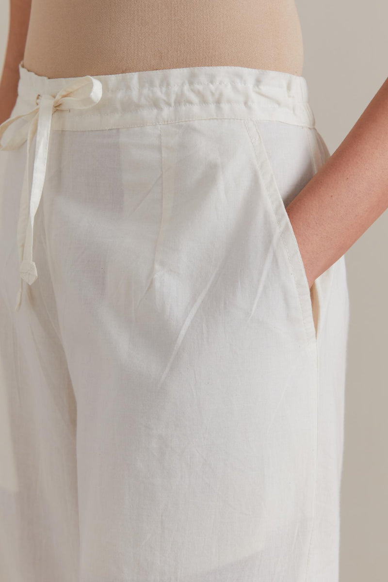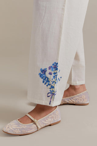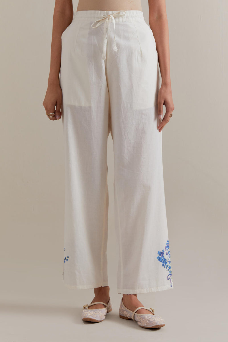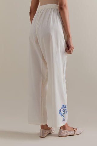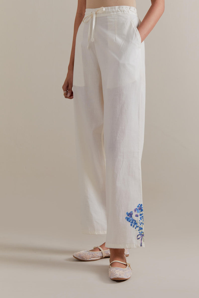 Off white cotton straight pants with Blue and green floral hand block printed boota at sides. It has side pockets and an elasticated waist band with drawstrings in the front for a better fit.