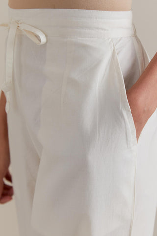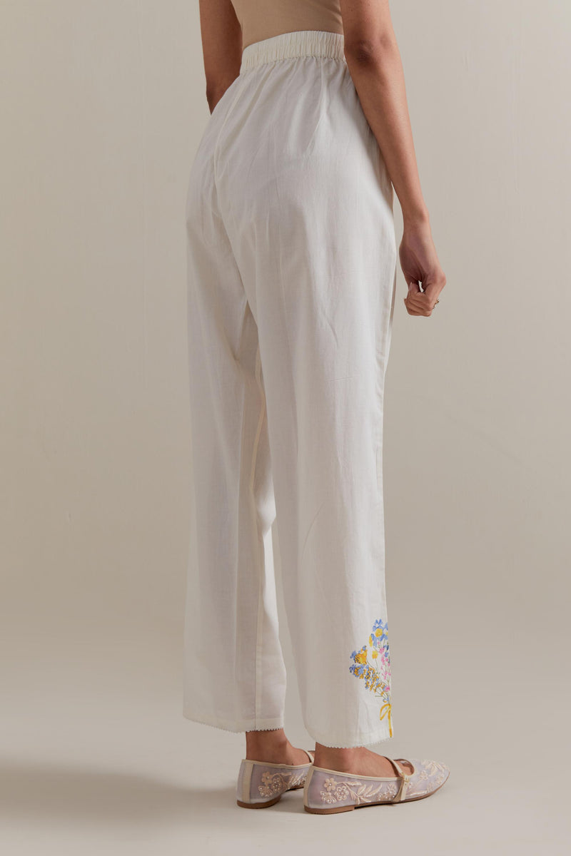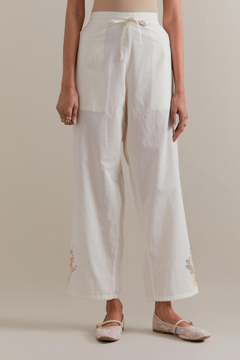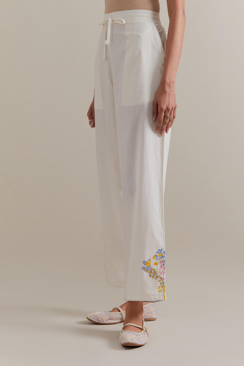 Off white cotton straight pants with multi floral hand block printed boota at sides. It has side pockets and an elasticated waist band with drawstrings in the front for a better fit.