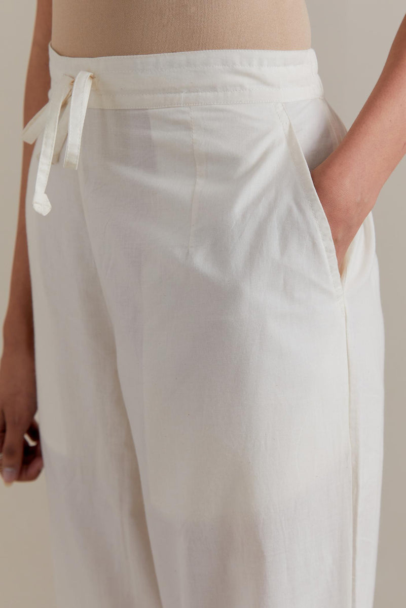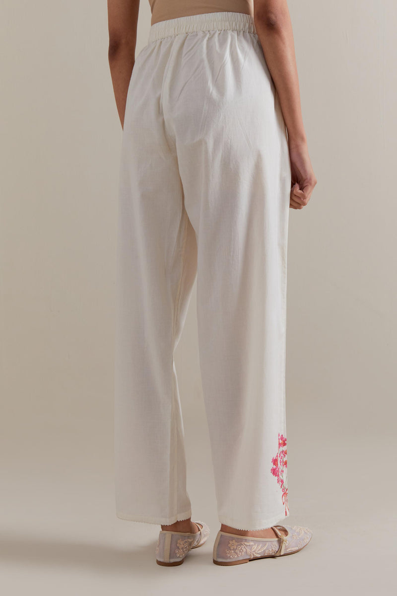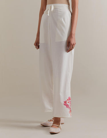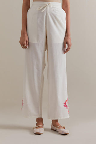 Off white cotton straight pants with Pink and green floral hand block printed boota at sides. It has side pockets and an elasticated waist band with drawstrings in the front for a better fit.