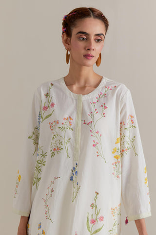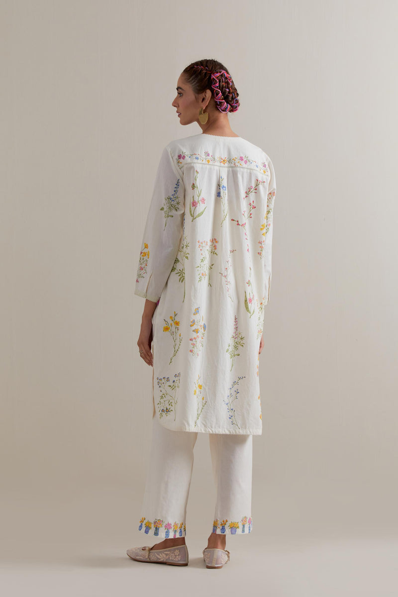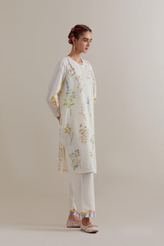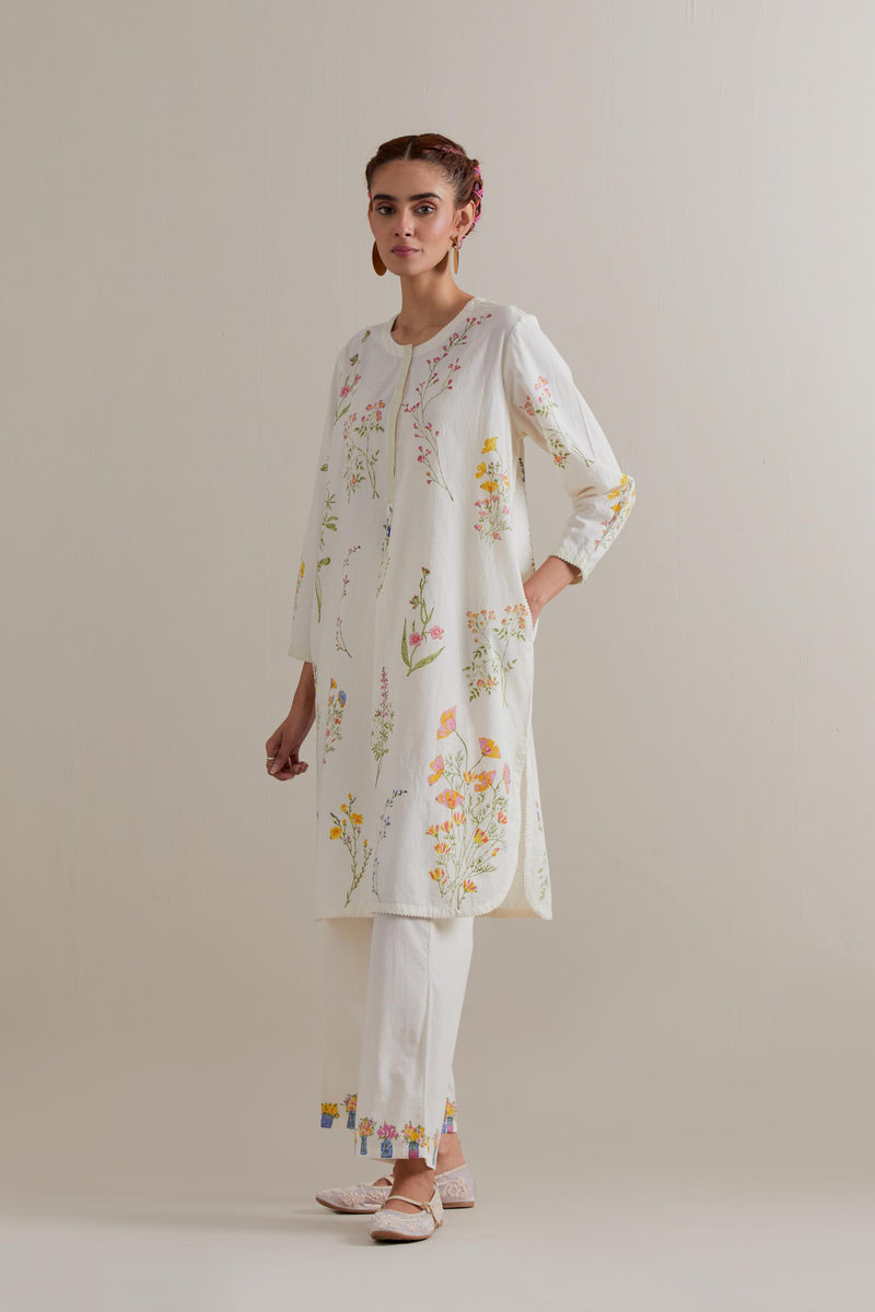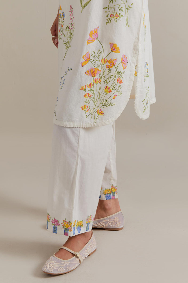 Off white cotton straight short kurta with all-over multi coloured flower hand block print and side pockets. It has a round neck with a button placket in the front. The edges of long sleeves, neck, side slits and round hem are finished with ricrac. Paired with Off white cotton straight pants with multi coloured small floral hand block printed border at hem. It has side pockets and an elasticated waist band with drawstrings in the front for a better fit. Comes with Off white cotton chanderi dupatta with all-over Pink & green floral hand block print. The edges of the dupatta are finished with ricrac. The corners of the dupatta have beaded tassels.