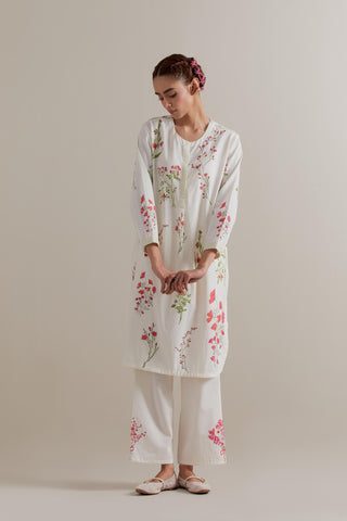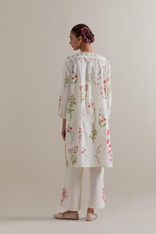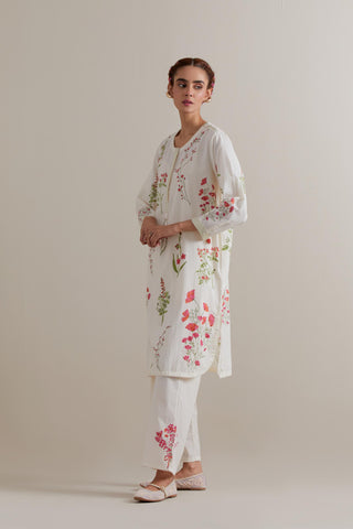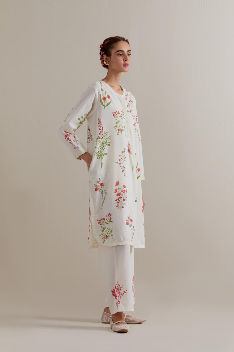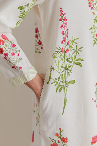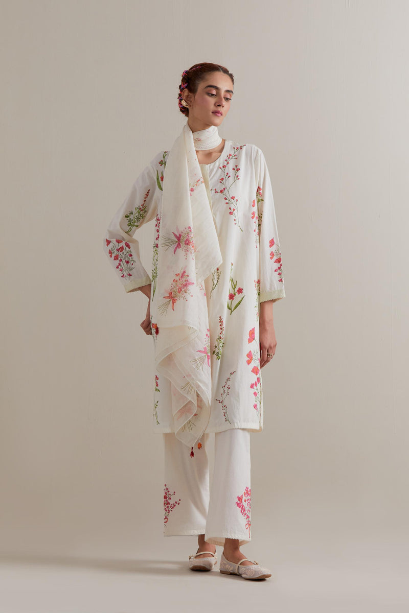 Off white cotton straight short kurta with all-over Pink & green coloured flower hand block print and side pockets. It has a round neck with a button placket in the front. The edges of long sleeves, neck, side slits and round hem are finished with ricrac. Paired with Off white cotton straight pants with Pink and green floral hand block printed boota at sides. It has side pockets and an elasticated waist band with drawstrings in the front for a better fit. Comes with Off white cotton chanderi dupatta with all-over Pink & green floral hand block print. The edges of the dupatta are finished with ricrac. The corners of the dupatta have beaded tassels.