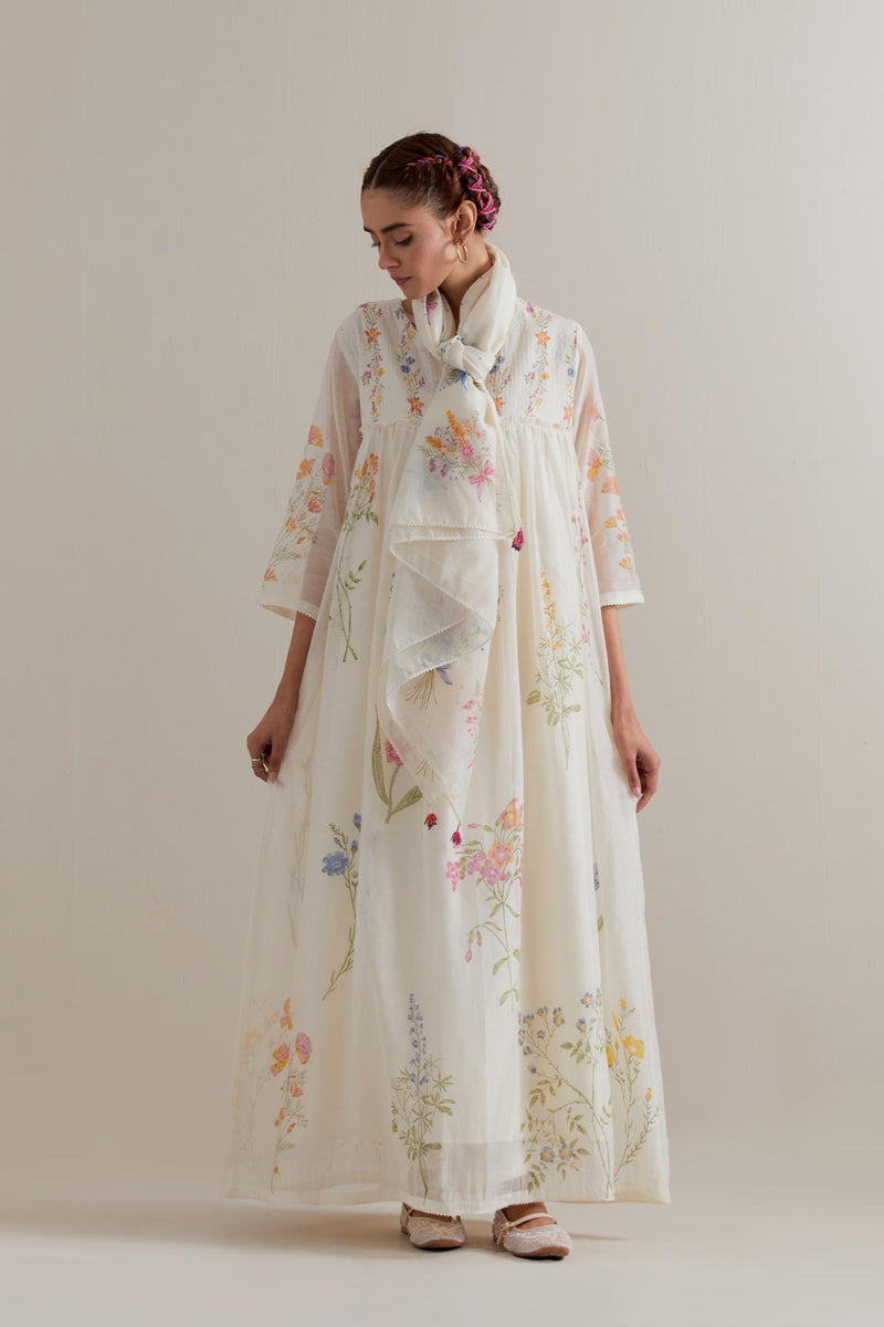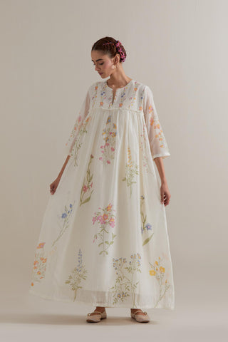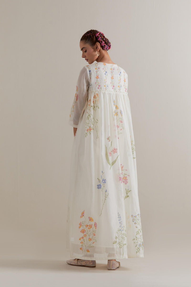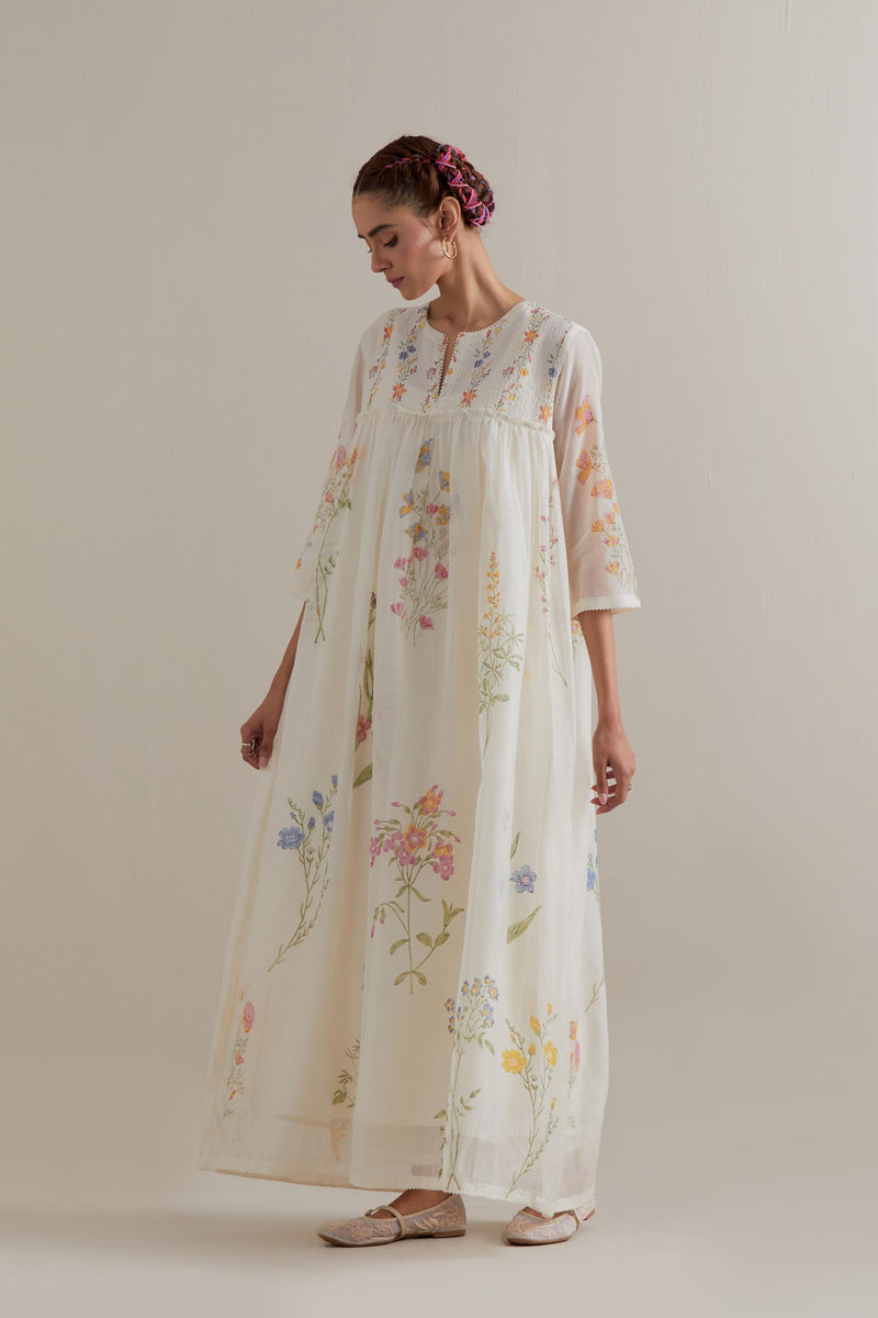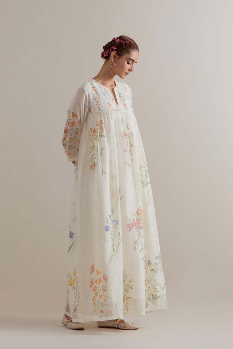 Off white hand block printed single-tiered kurta with quilted yoke and all-over Multi coloured flower. The edges of neck, sleeve and hem finished with ricrac. It has a round neckline with a slit in the front and 3/4 sleeves. Worn with a cotton slip. Paired with Off white cotton straight pants with Multi floral hand block printed boota at sides. It has side pockets and an elasticated waist band with drawstrings in the front for a better fit. Comes with Off white cotton chanderi dupatta with all-over Multi floral hand block print. The edges of the dupatta are finished with ricrac. The corners of the dupatta have beaded tassels.