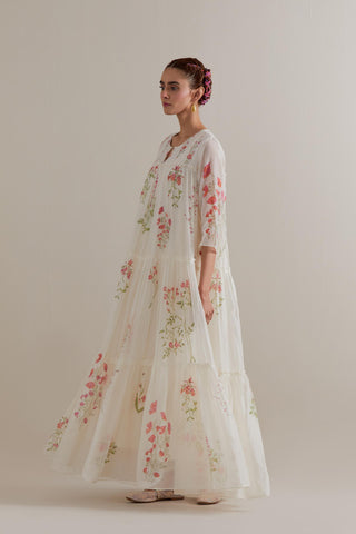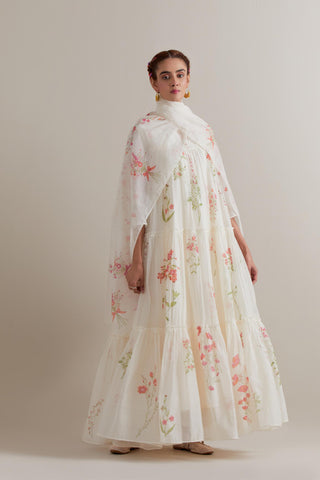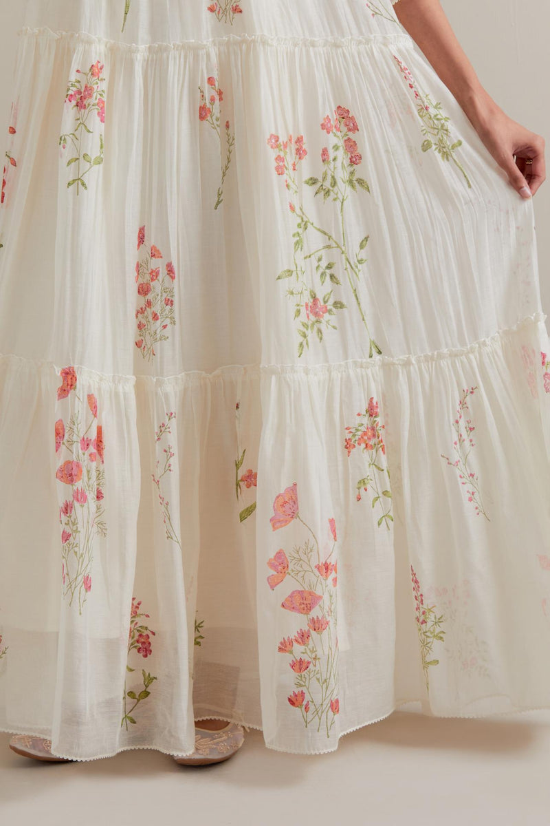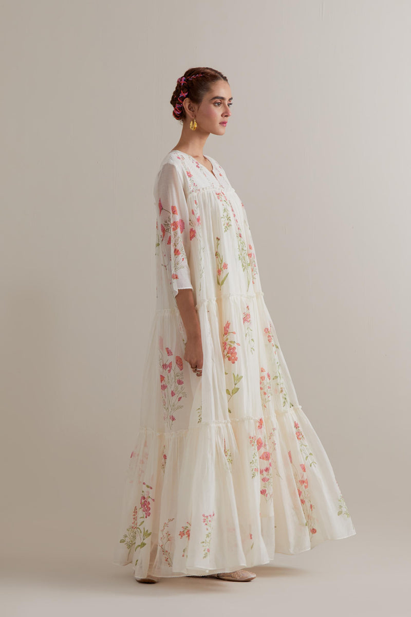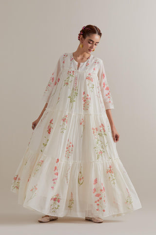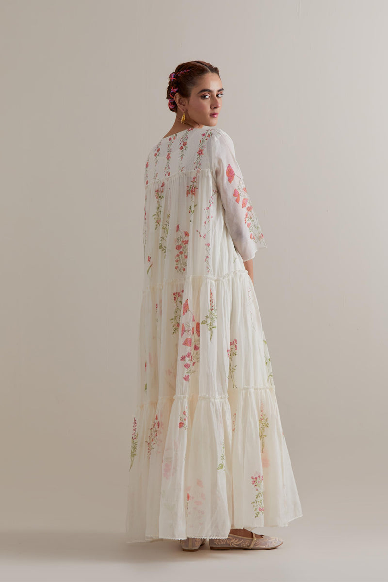 Off white hand block printed three-tiered kurta set with quilted yoke and all-over Pink & green coloured flower. Sale