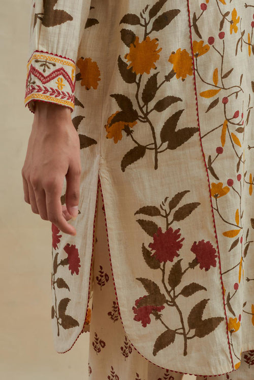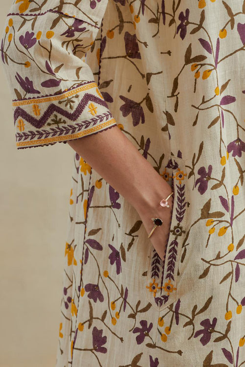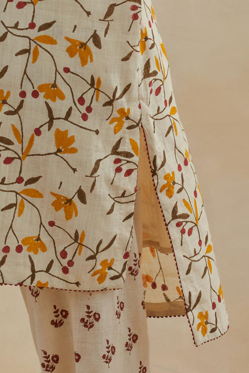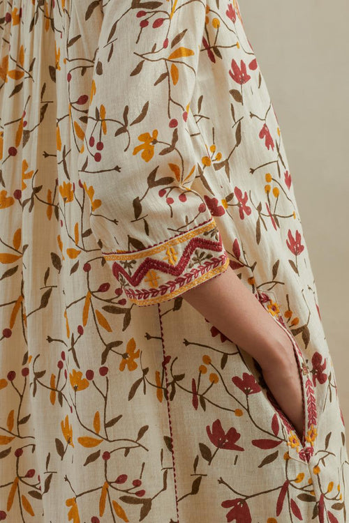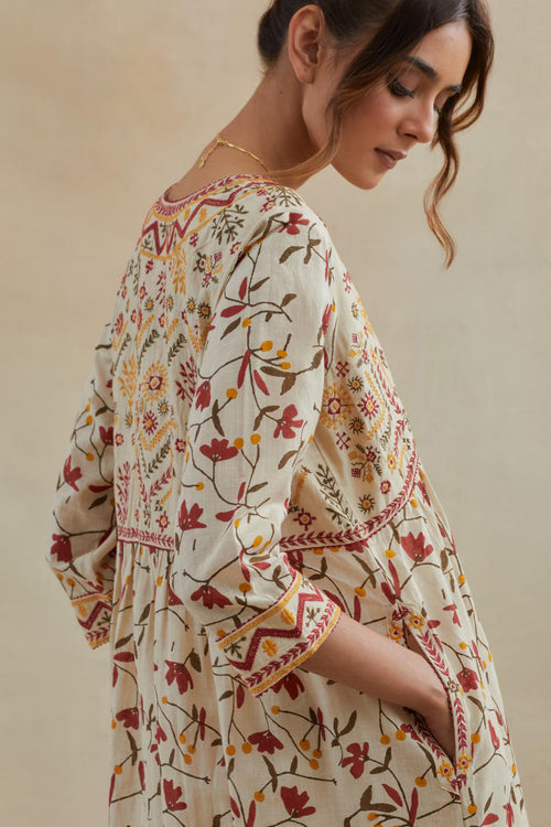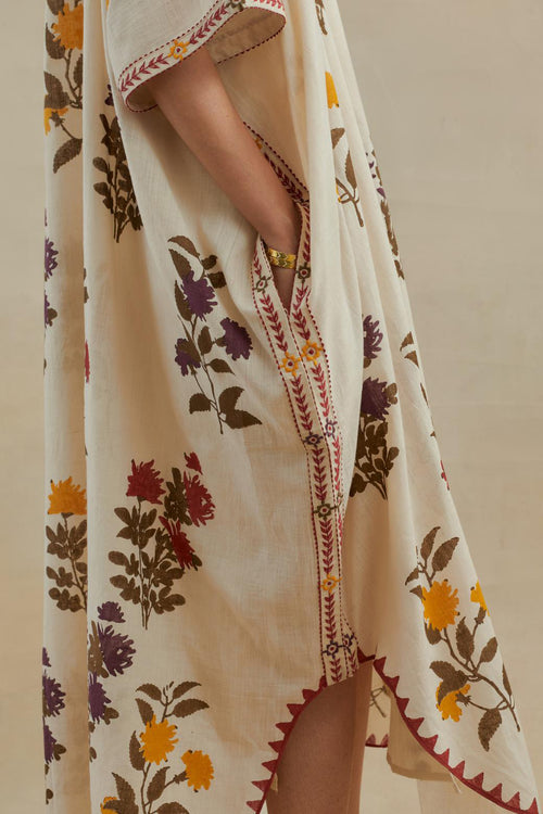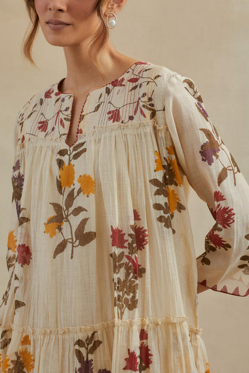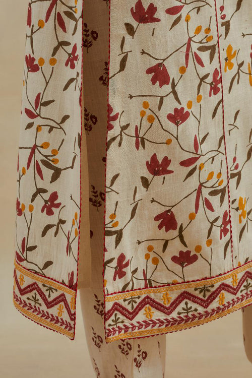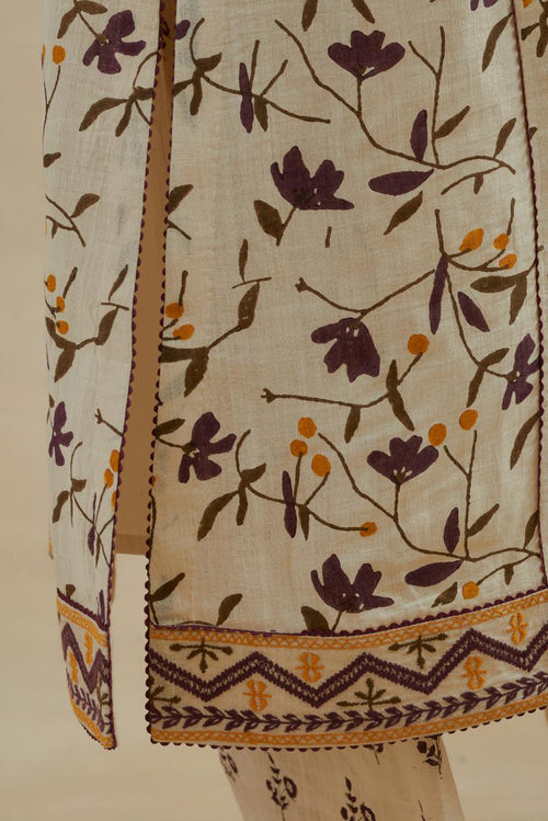 Beige cotton chanderi dupatta with all-over multi colored hand block print.