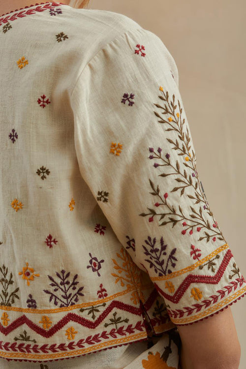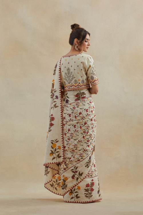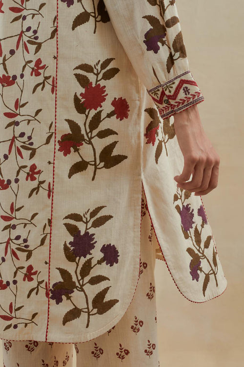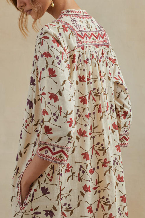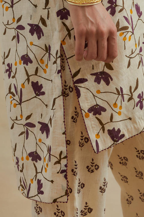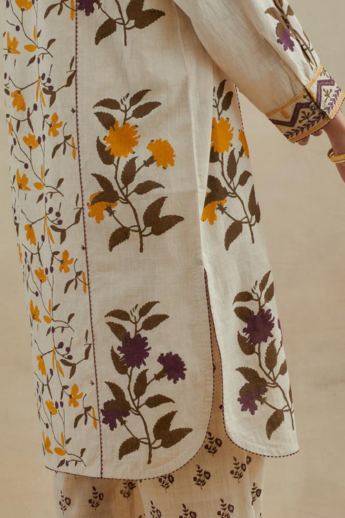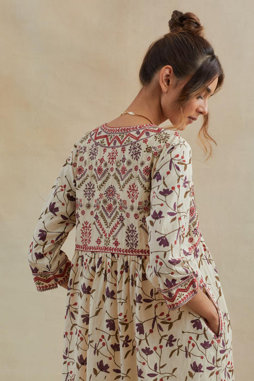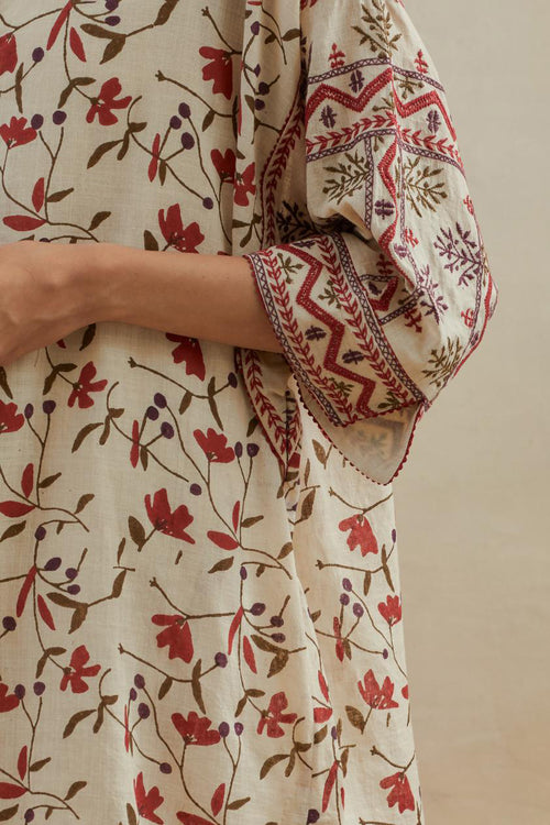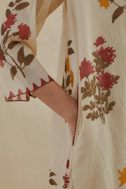 Beige cotton chanderi dupatta with all-over multi colored hand block print.