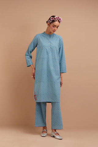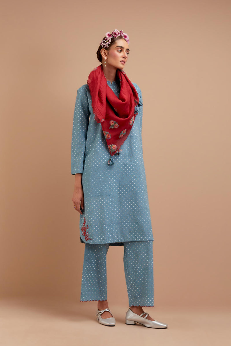 Cadet Blue Cotton straight short kurta with all-over polka dot hand block print & embroidered floral bootas at the side hem and side pockets. It has a round neck with a button placket in the front and 3/4 sleeves. Paired with Cadet Blue Cotton straight pants with all-over polka dot hand block print, highlighted with scalloped edges at hem. It has side pockets and an elasticated waist band with drawstrings in the front for a better fit. Comes with Red Cotton Chanderi dupatta with pink and yellow hand block printed applique, highlighted with scalloped edges. The corners are finished with fabric tassels.