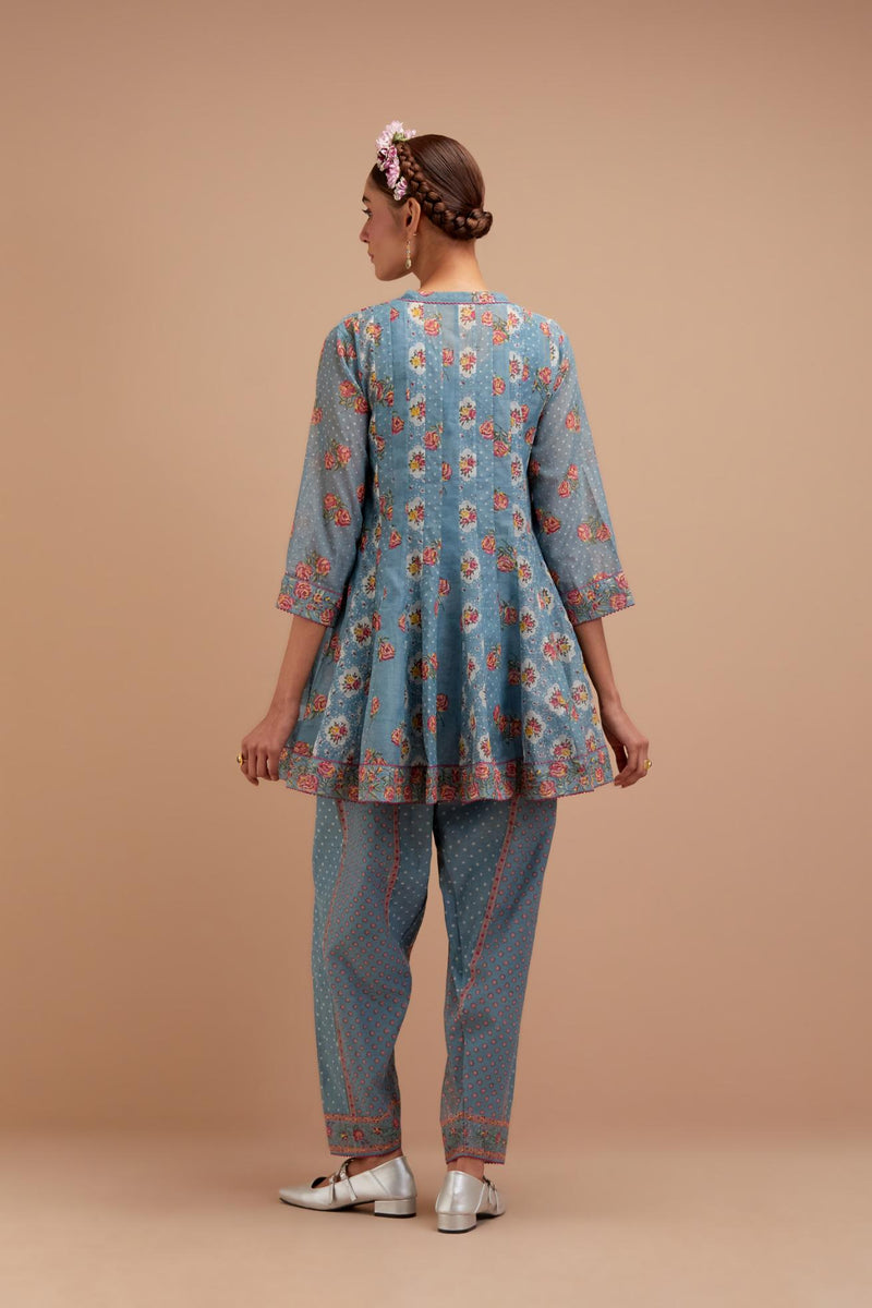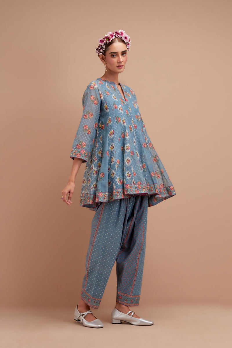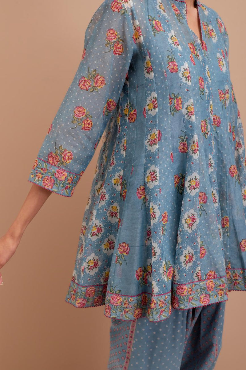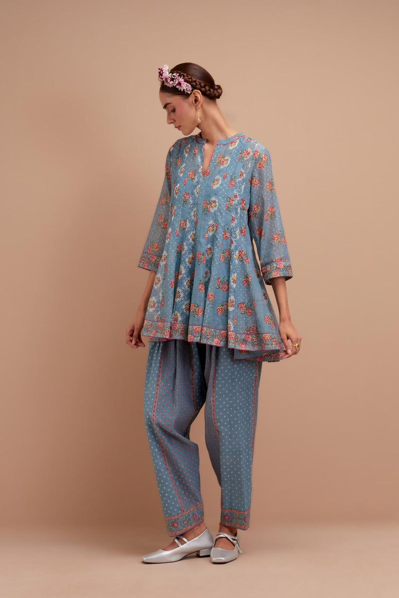 Cadet Blue Silk Chanderi paneled kurta with all-over small Pink & Yellow flower hand block print. It has round neckline with slit in front. The edges of 3/4 sleeves, neck and hem are finished with ricrac. The kurta comes with fine cotton slip. Paired with Cadet Blue Cotton Chanderi salwar with all-over hand block print. It has a drawstring at the waist for better fitting. This garment is fully lined. Comes with Red Cotton Chanderi dupatta with pink and yellow hand block printed applique, highlighted with scalloped edges. The corners are finished with fabric tassels.