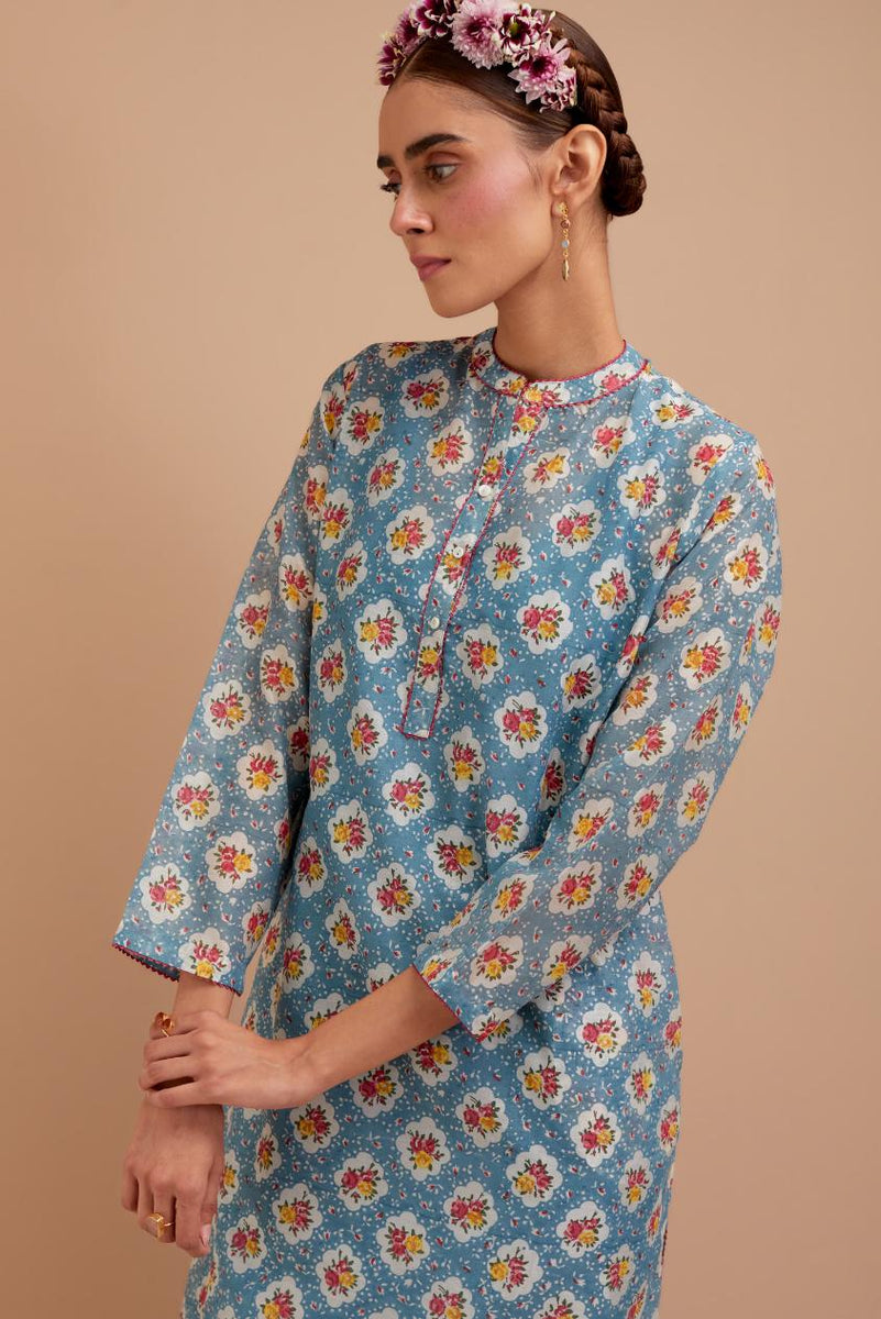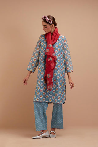 Cadet Blue Silk Chanderi straight short kurta with all-over Pink & Yellow floral hand block print and side pockets. It has a round neck with a button placket in the front. The edges of 3/4 sleeves, neck, side slits and round hem are finished with ricrac. The kurta comes with fine cotton slip. Paired with Cadet Blue Cotton straight pants with all-polka dot hand block print, highlighted with scalloped edges at hem. It has side pockets and an elasticated waist band with drawstrings in the front for a better fit. Comes with Red Cotton Chanderi dupatta with pink and yellow hand block printed applique, highlighted with scalloped edges. The corners are finished with fabric tassels.