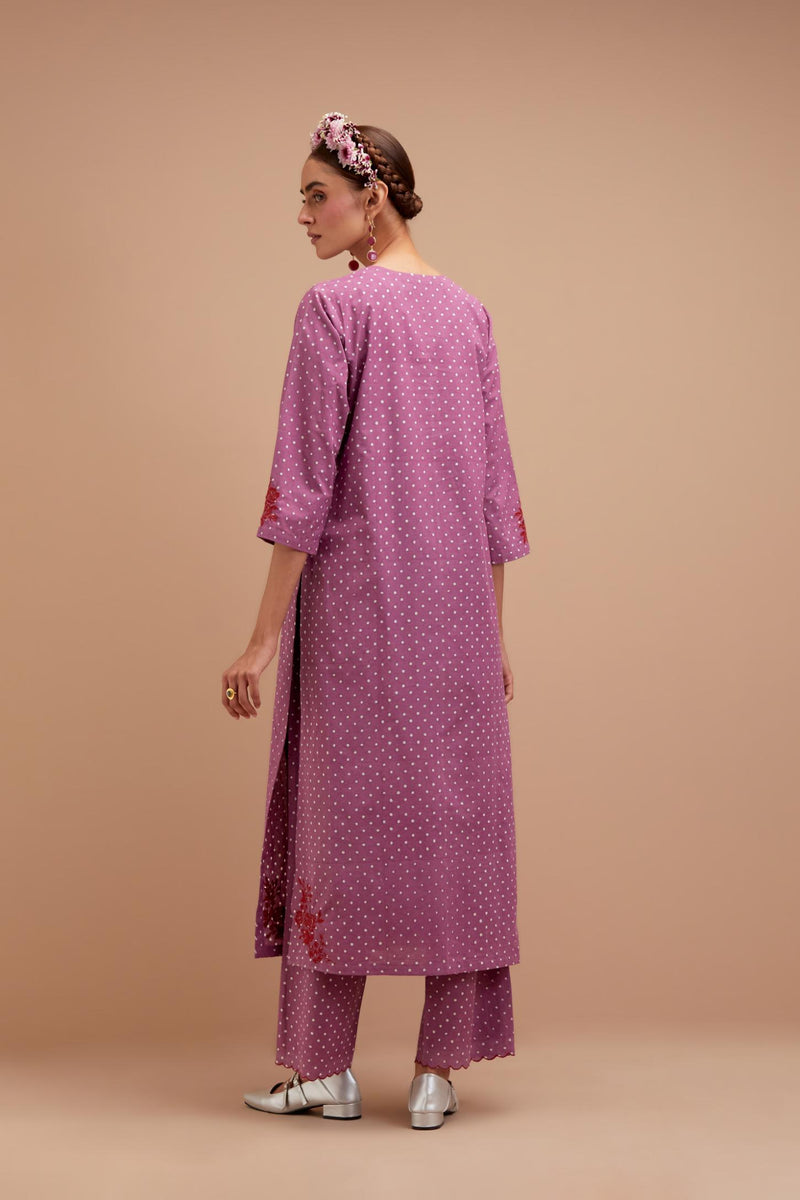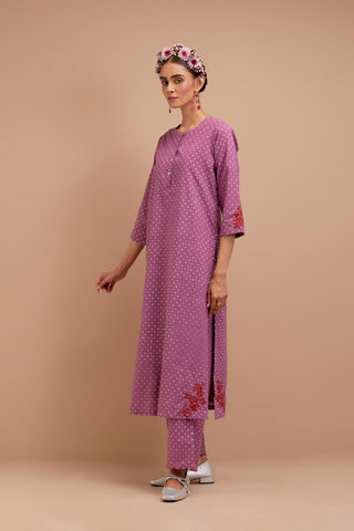 Dark Mauve Cotton straight long kurta with all-over polka dot hand block print & embroidered floral bootas at the side hem. It has a round neck with a button placket in the front and 3/4 sleeves. Paired with Dark Mauve Cotton straight pants with all-polka dot hand block print, highlighted with scalloped edges at hem. It has side pockets and an elasticated waist band with drawstrings in the front for a better fit. Comes with Red Cotton Chanderi dupatta with pink and yellow hand block printed applique, highlighted with scalloped edges. The corners are finished with fabric tassels.