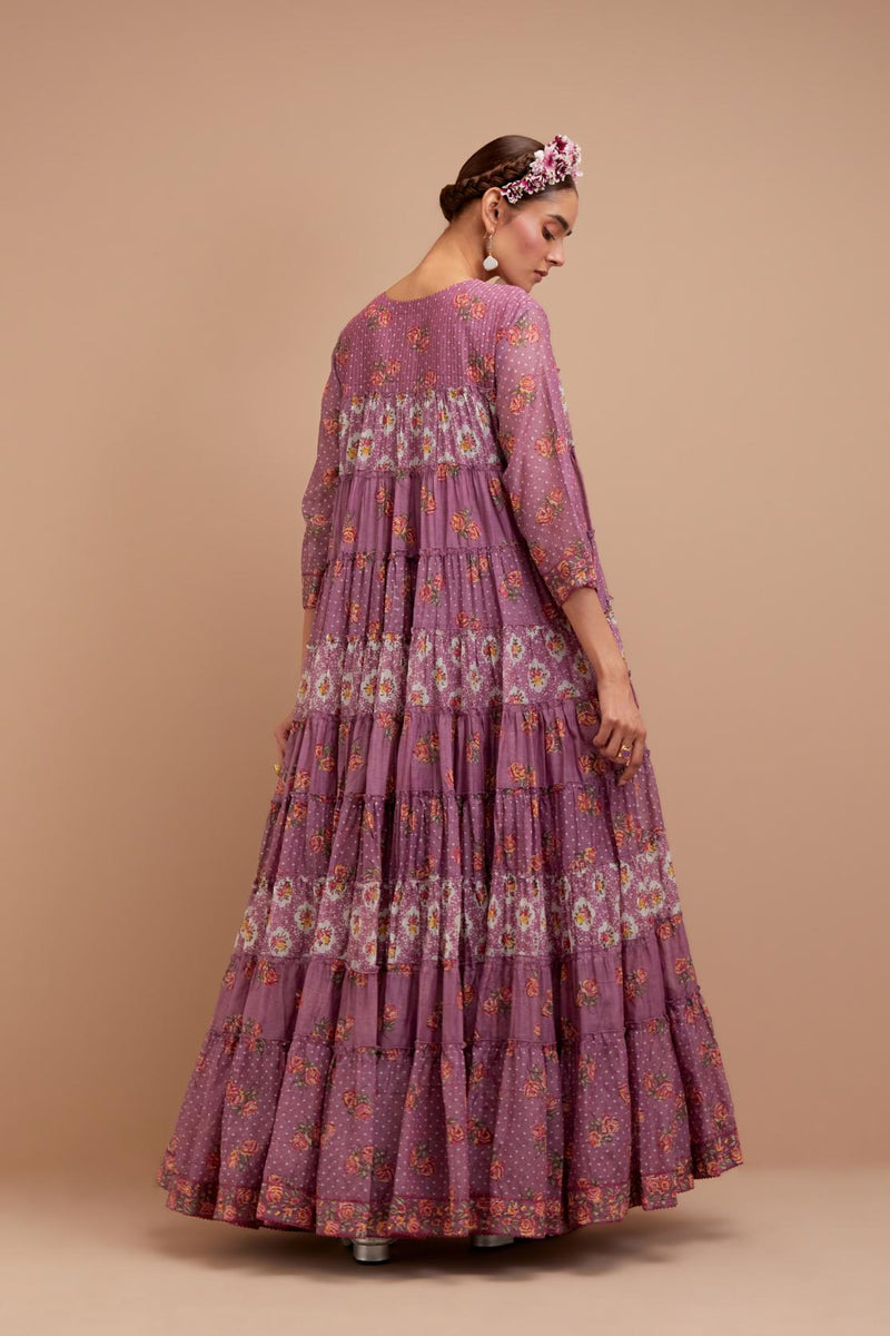 Dark Mauve hand block printed multi-tiered kurta dress set with 3/4 sl – Upavita icon