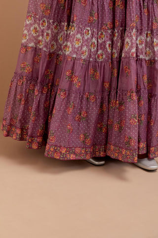 Dark Mauve hand block printed multi-tiered kurta dress set with 3/4 sleeves, highlighted with quilted yoke in front and back. Sale