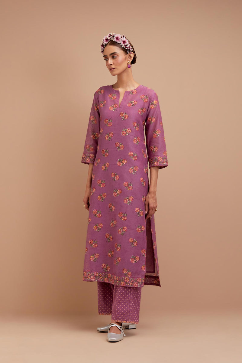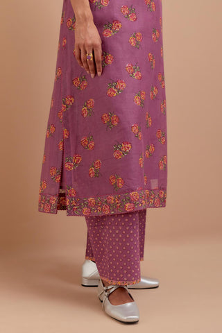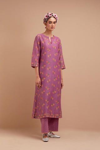 Dark Mauve Silk Chanderi straight kurta with all-over Pink & Yellow floral hand block print. It has round neck with a slit in the front. The edges of 3/4 sleeves, neck, side slits and hem are finished with ricrac. The kurta comes with fine cotton slip. Paired with Dark Mauve Cotton straight pants with all-over small flower hand block print. It has side pockets and an elasticated waist band with drawstrings in the front for a better fit. Comes with Red Cotton Chanderi dupatta with pink and yellow hand block printed applique, highlighted with scalloped edges. The corners are finished with fabric tassels.