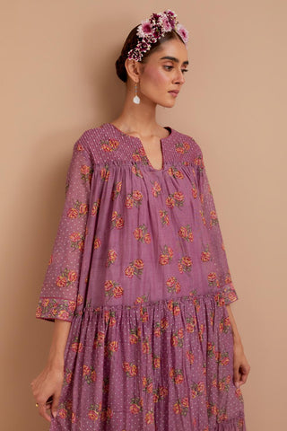 Dark Mauve three-tiered kurta set with quilted yoke and all-over Pink & Yellow floral hand block print. Sale