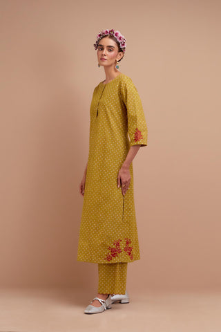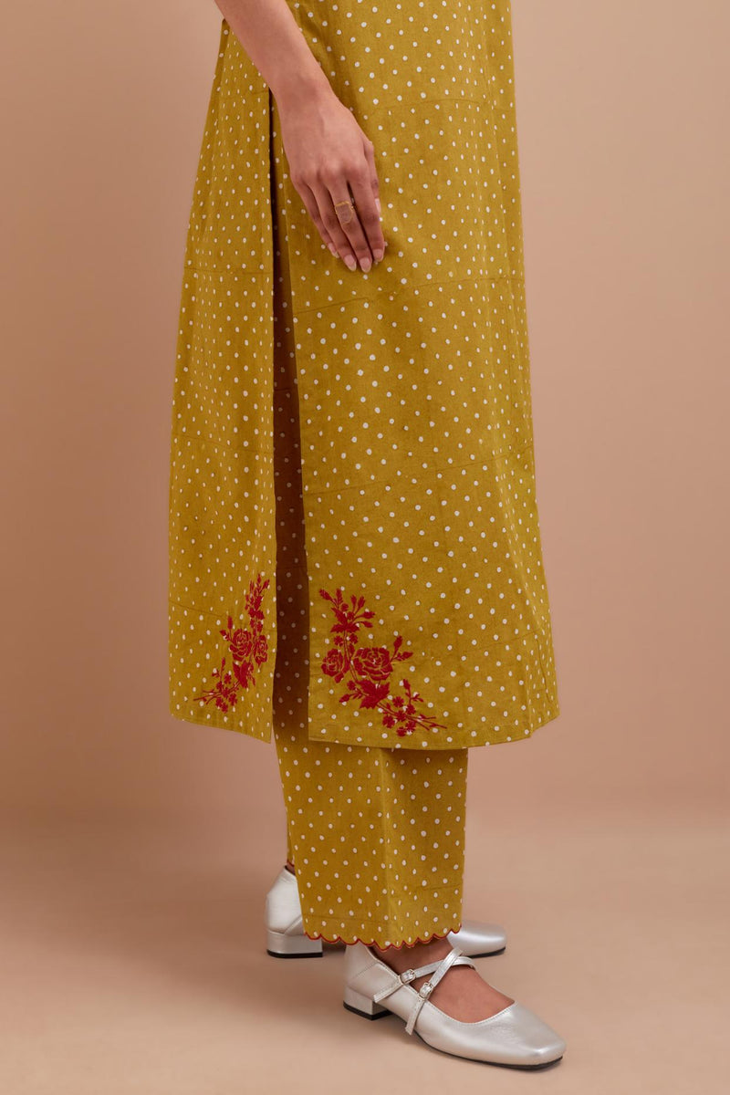 Olive Yellow Cotton straight long kurta set with all-over polka dot hand block print & embroidered floral bootas at the side hem. Sale