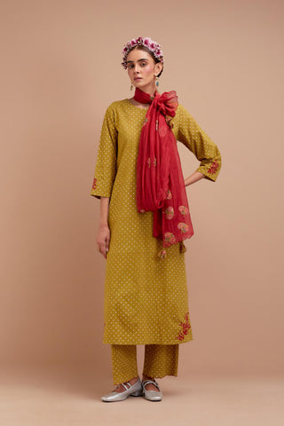 Olive Yellow Cotton straight long kurta set with all-over polka dot ha – Upavita icon