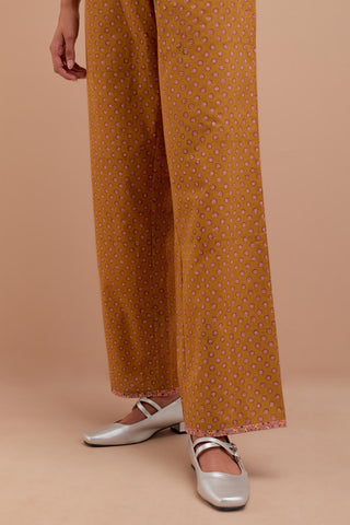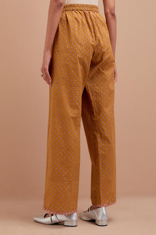 Olive Yellow Cotton straight pants with all-over small flower hand block print. It has side pockets and an elasticated waist band with drawstrings in the front for a better fit.