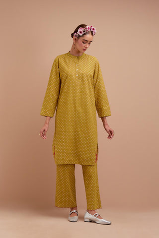 Olive Yellow Cotton straight short kurta set with all-over polka dot h – Upavita icon