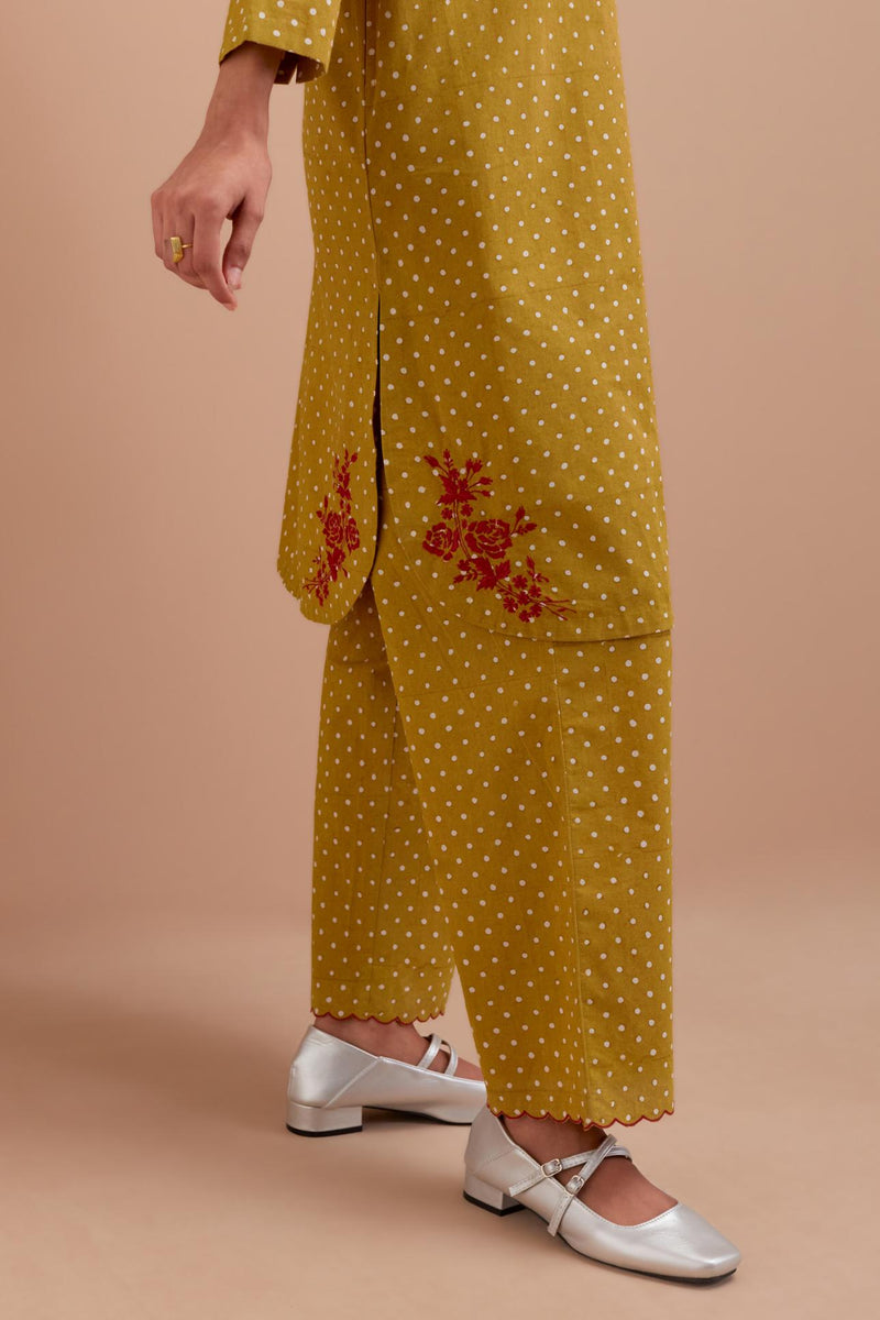 Olive Yellow Cotton straight short kurta set with all-over polka dot hand block print & embroidered floral bootas at the side hem. Sale