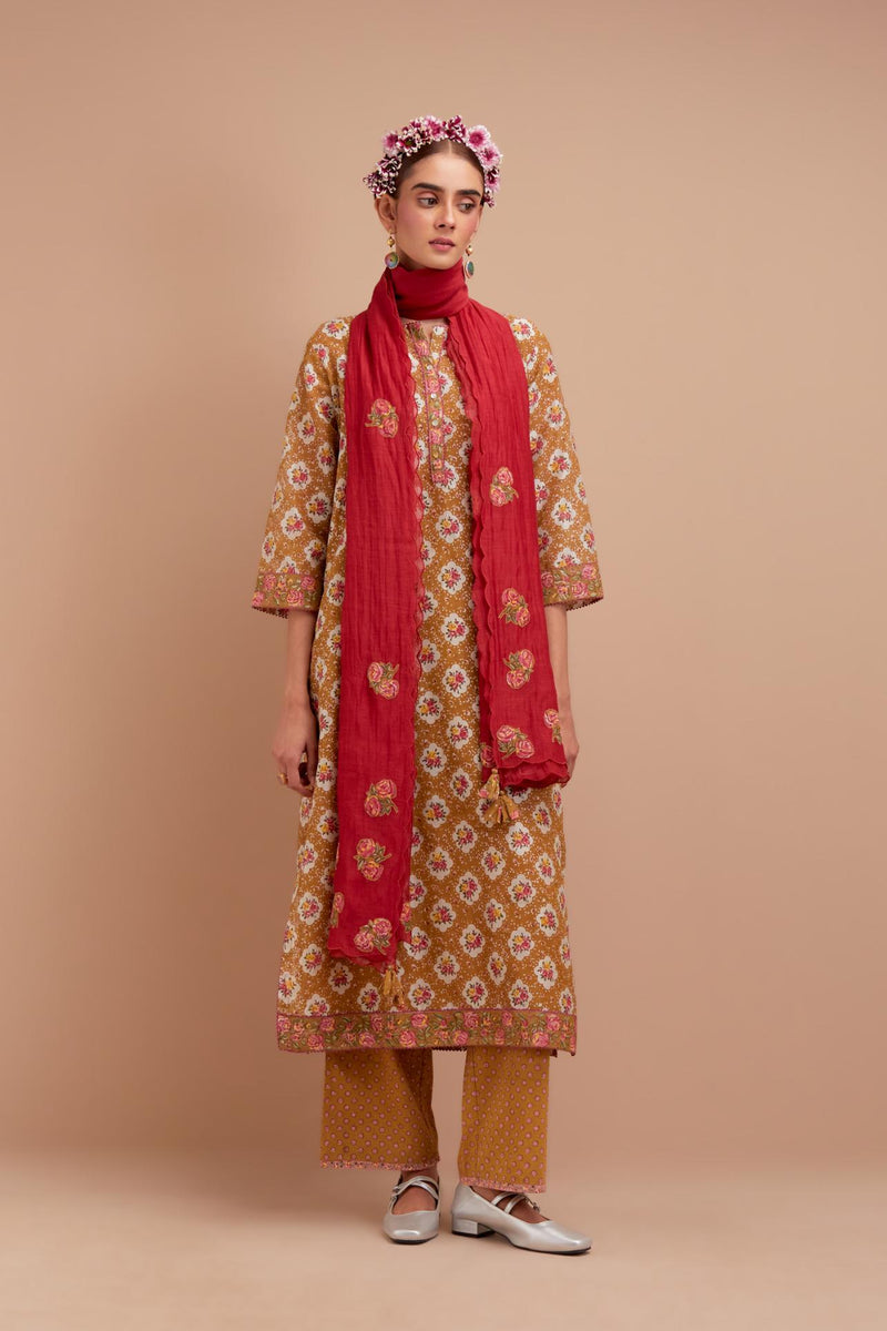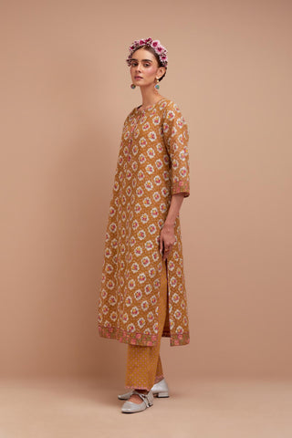 Olive Yellow Silk Chanderi kurta set with all-over Pink & Yellow flora – Upavita icon