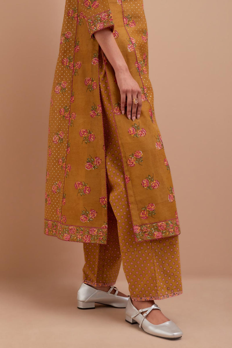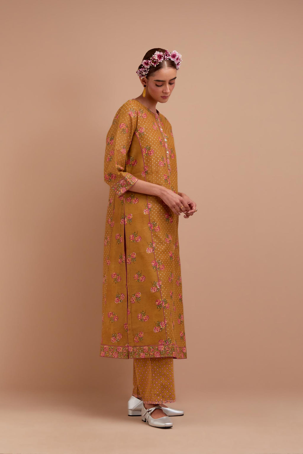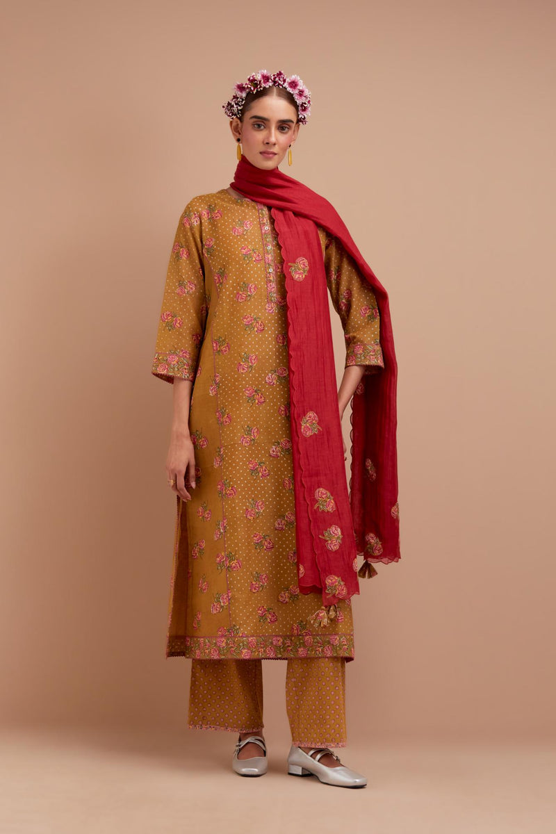 Olive Yellow Silk Chanderi kurta with all-over Pink & Yellow floral hand-block print and side panels. It has a round neck with a button placket in the front and sleeves are 3/4th. The kurta is finished with the ricrac lace at the edges of neck, sleeves, panels, side slits and hem. The kurta comes with fine cotton slip. Paired with Olive Yellow Cotton straight pants with all-over small flower hand block print. It has side pockets and an elasticated waist band with drawstrings in the front for a better fit. Comes with Red Cotton Chanderi dupatta with pink and yellow hand block printed applique, highlighted with scalloped edges. The corners are finished with fabric tassels.