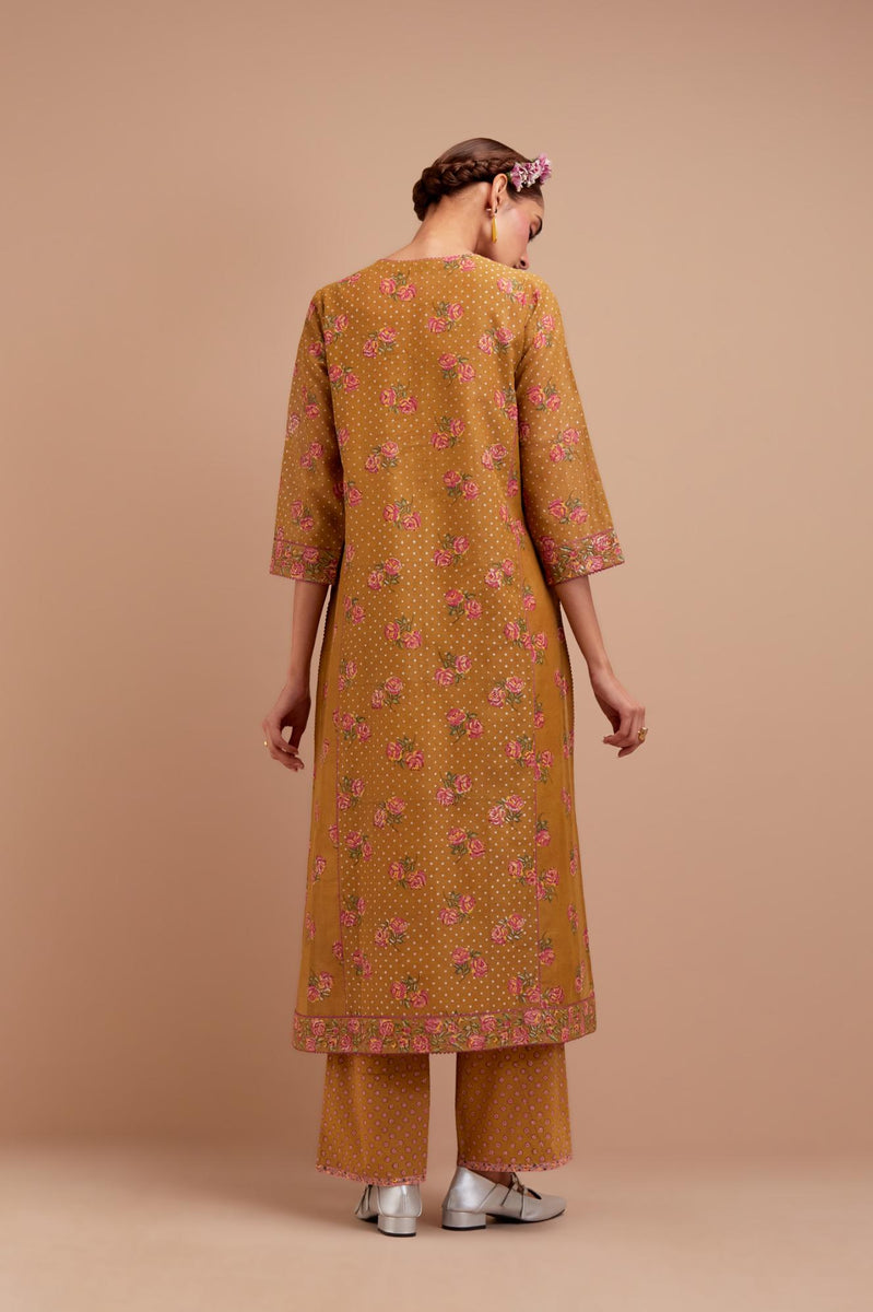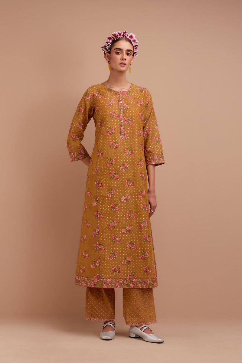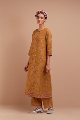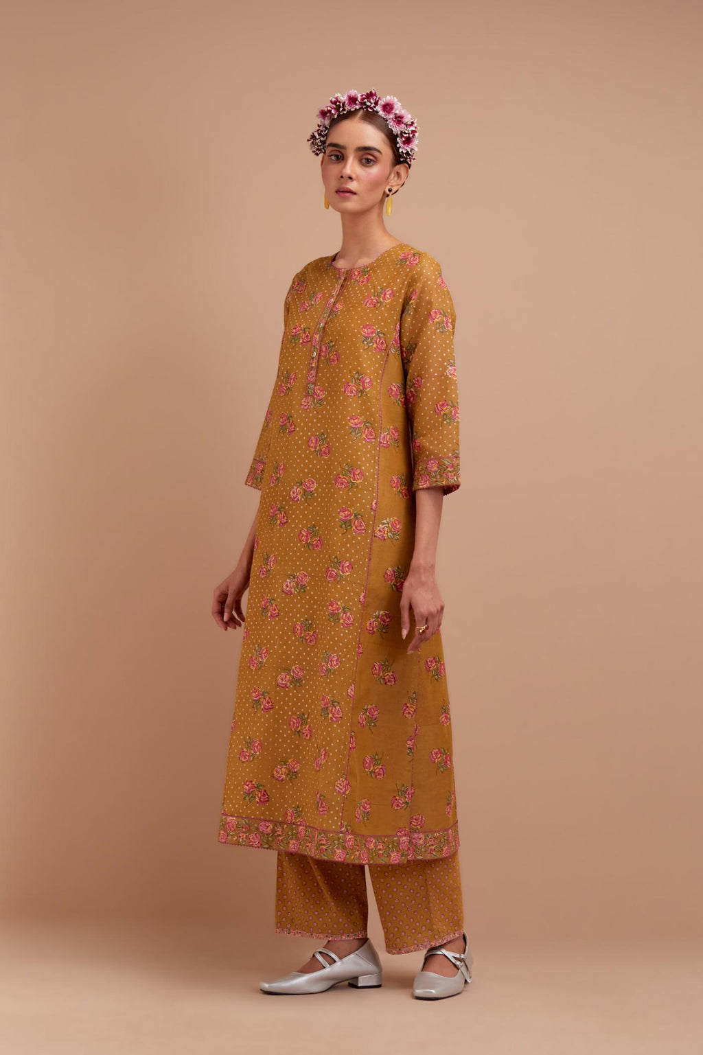 Olive Yellow Silk Chanderi kurta with all-over Pink & Yellow floral hand-block print and side panels. It has a round neck with a button placket in the front and sleeves are 3/4th. The kurta is finished with the ricrac lace at the edges of neck, sleeves, panels, side slits and hem. The kurta comes with fine cotton slip. Paired with Olive Yellow Cotton straight pants with all-over small flower hand block print. It has side pockets and an elasticated waist band with drawstrings in the front for a better fit. Comes with Red Cotton Chanderi dupatta with pink and yellow hand block printed applique, highlighted with scalloped edges. The corners are finished with fabric tassels.