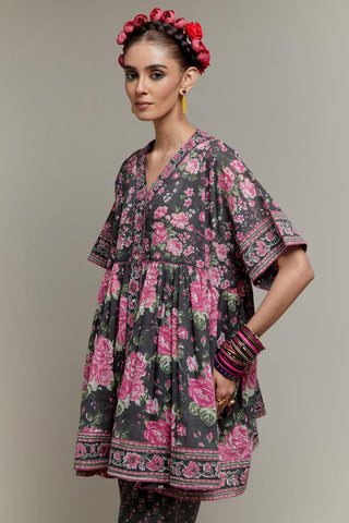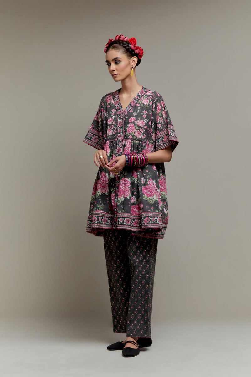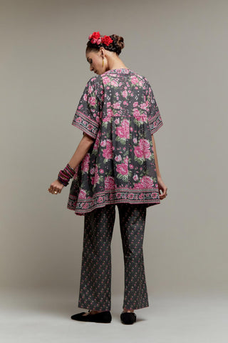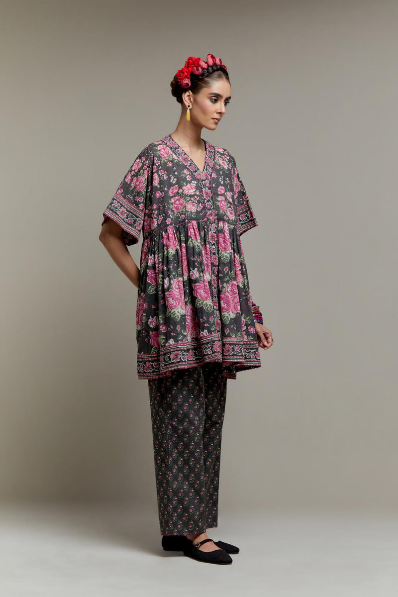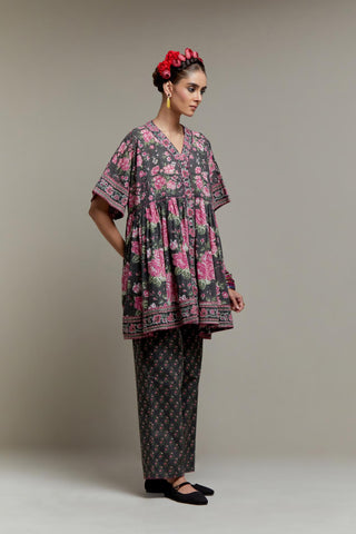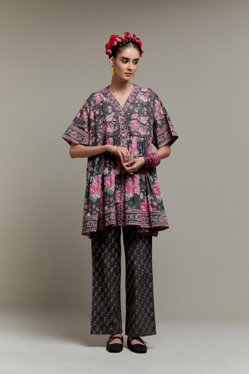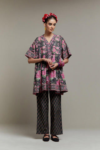 Black and Pink Cotton hand block printed short top with all-over Pink & Green colored flower, paired with Black Cotton straight pants with all-over small flower hand block print. Sale
