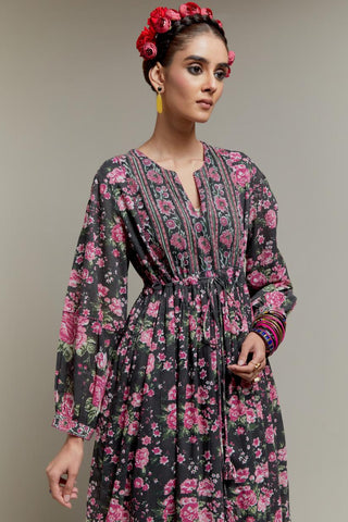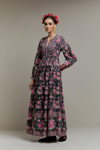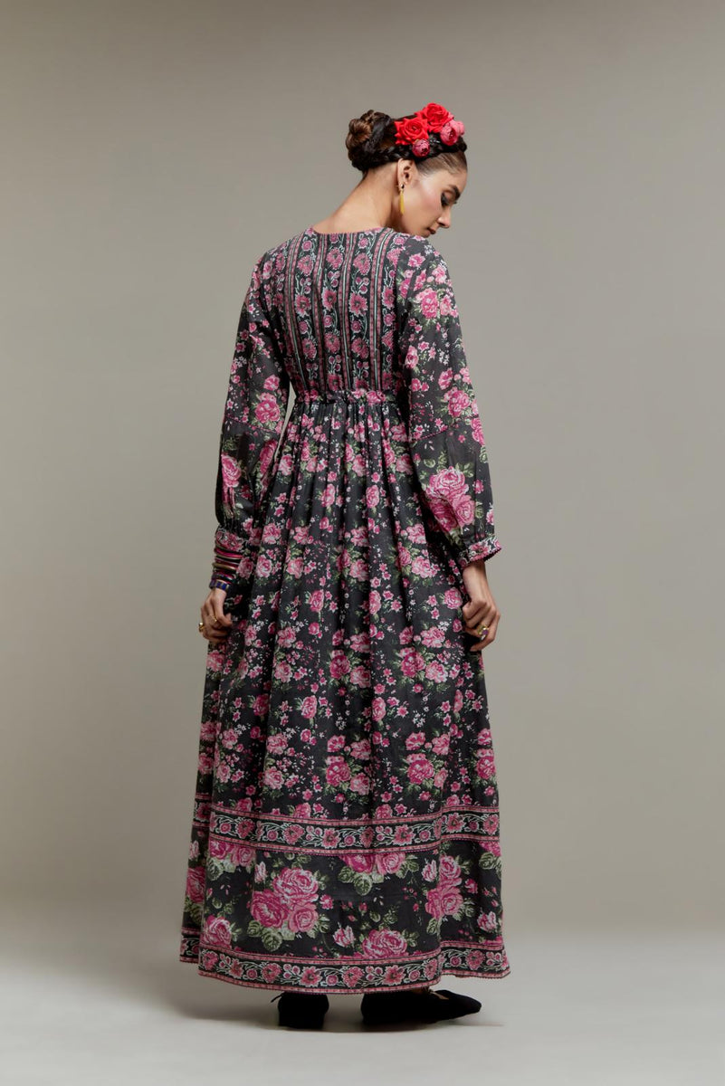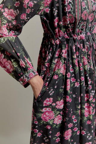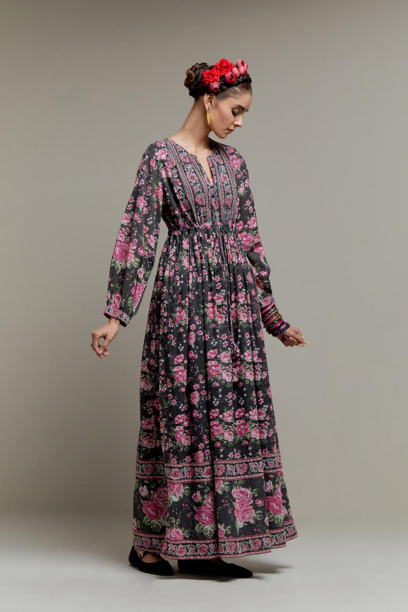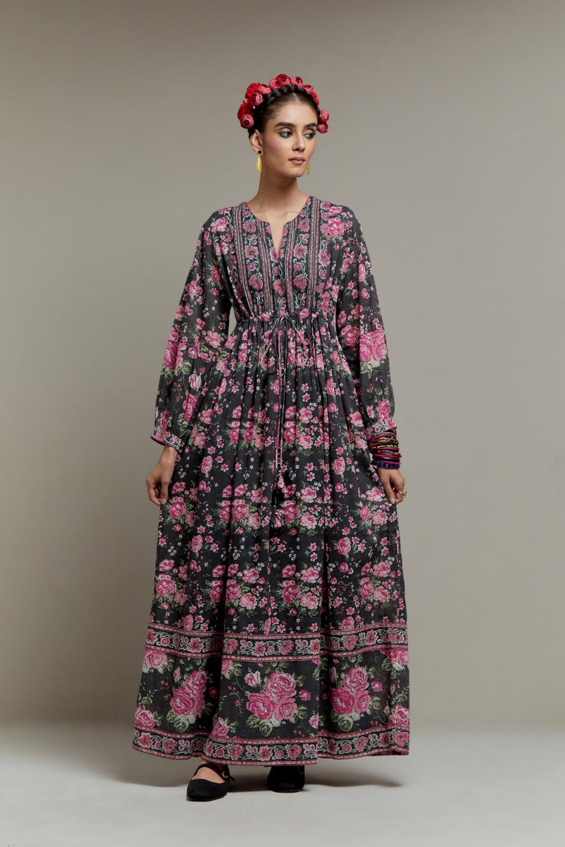 Black & Pink hand block printed long dress with full sleeve and tying cord at waistline. It has round neck and slit in the front & side pockets. The dress is finished with contrast colored ricrac lace at the edges of neck, sleeves and hem. The garment is lined with tonal cotton.