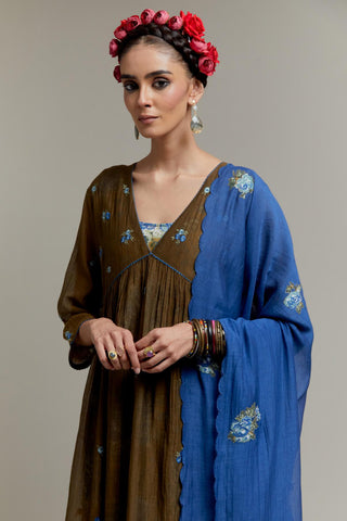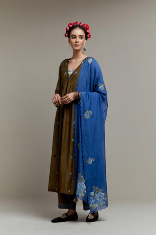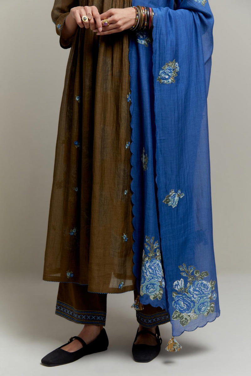 Chelsea Blue Cotton Chanderi dupatta with blue and green hand block printed applique, highlighted with scalloped edges. The corners are finished with fabric tassels.