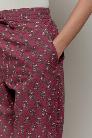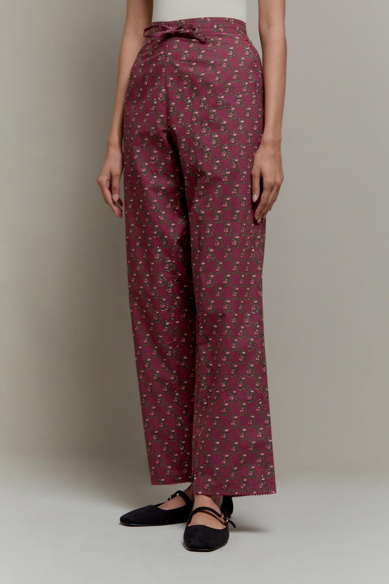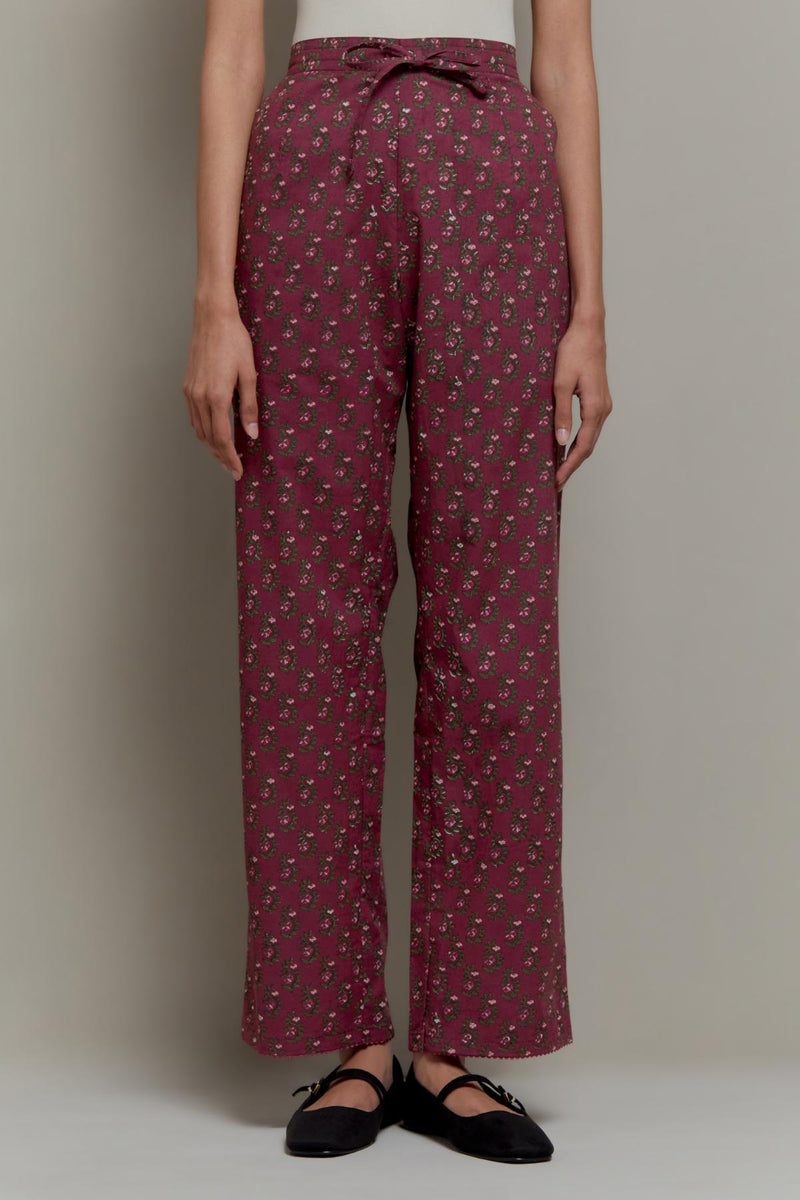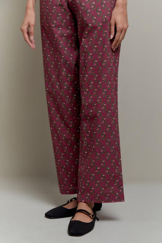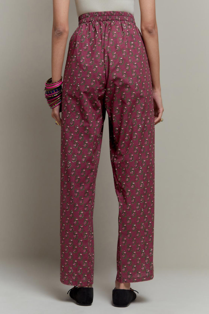 Crimson rose Cotton straight pants with all-over small flower hand block print. It has side pockets and an elasticated waist band with drawstrings in the front for a better fit.