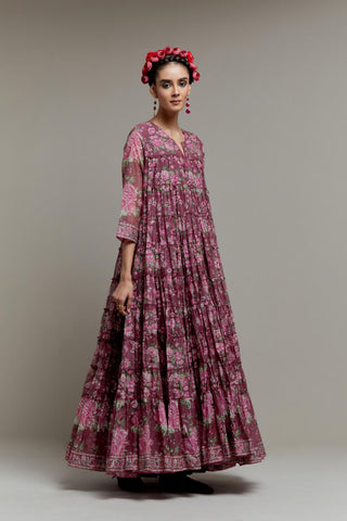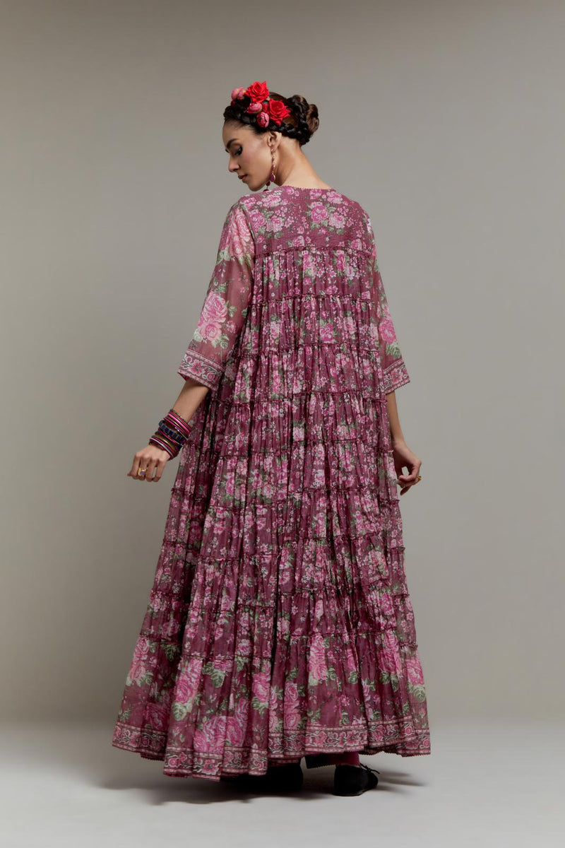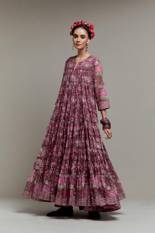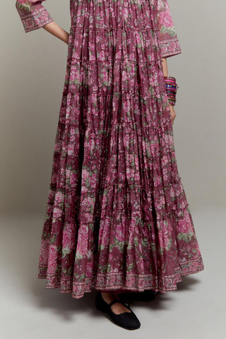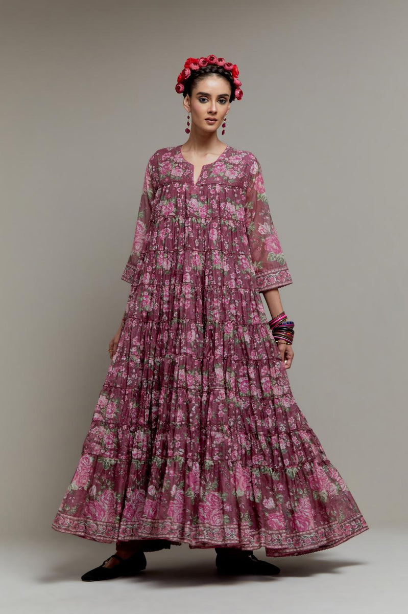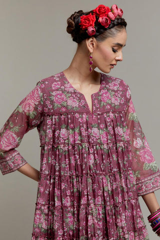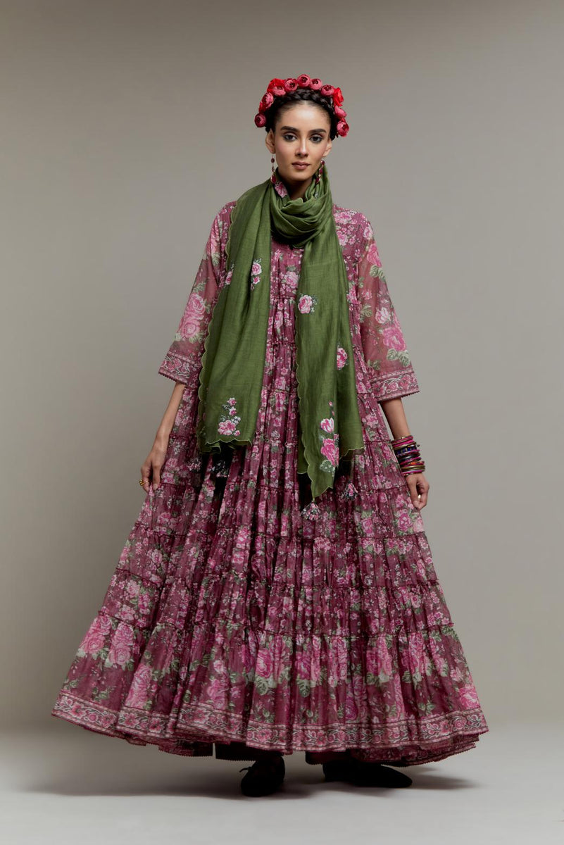 Crimson rose hand block printed multi-tiered kurta dress with 3/4 sleeves, highlighted with quilted yoke in front and back. It has round neck and slit in the front & 3/4 sleeves. The kurta is finished with contrast colored ricrac lace at the edges of neck, sleeves and hem. The kurta comes with fine cotton slip. Paired with Crimson rose straight pants with small floral booti embroidery at bottom hem. The waistband is elasticated at the back with drawstrings in the front for better fitting. It also has side pockets. Comes with Olive Cotton Chanderi dupatta with pink and green hand block printed applique, highlighted with scalloped edges. The corners are finished with fabric tassels.