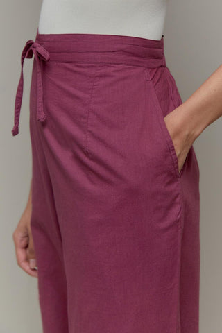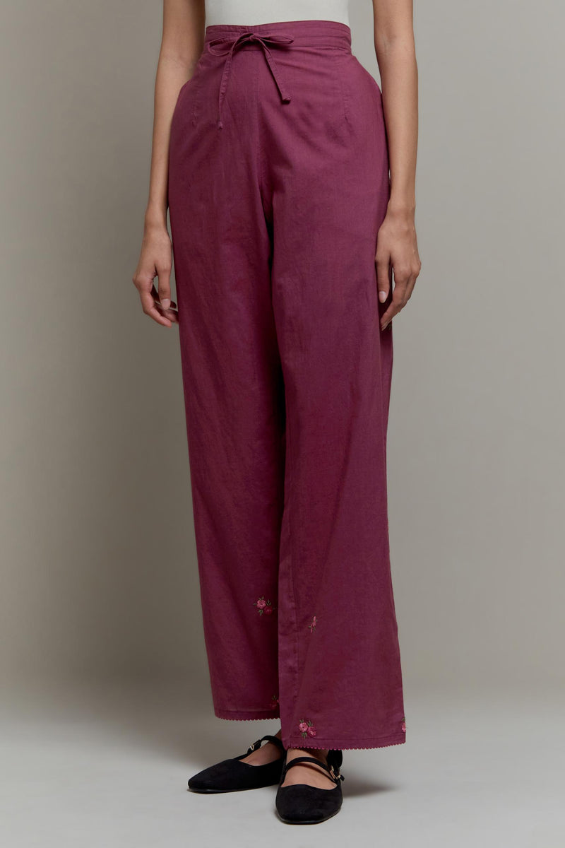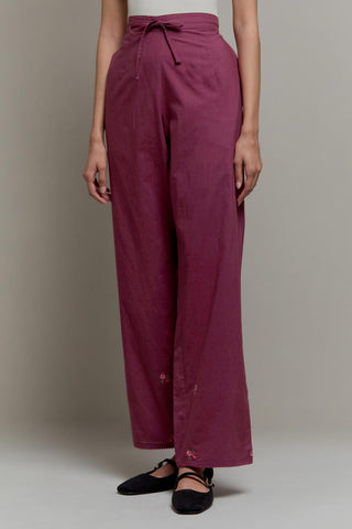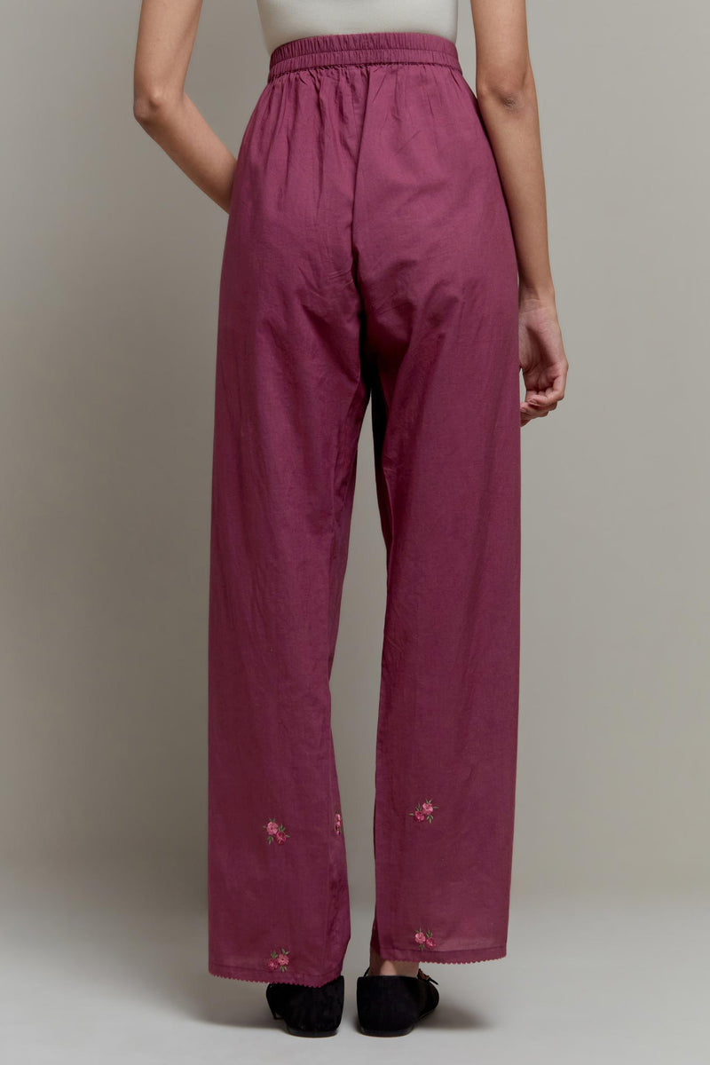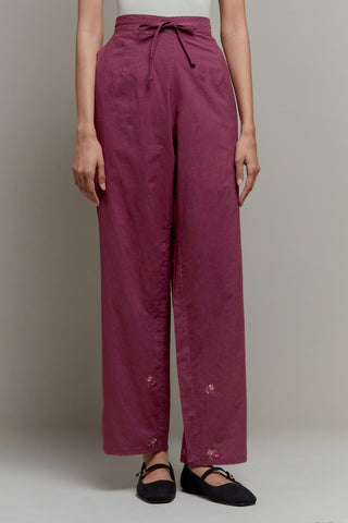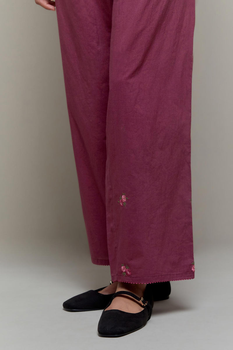 Crimson rose straight pants with small floral booti embroidery at bottom hem. The waistband is elasticated at the back with drawstrings in the front for better fitting. It also has side pockets.
