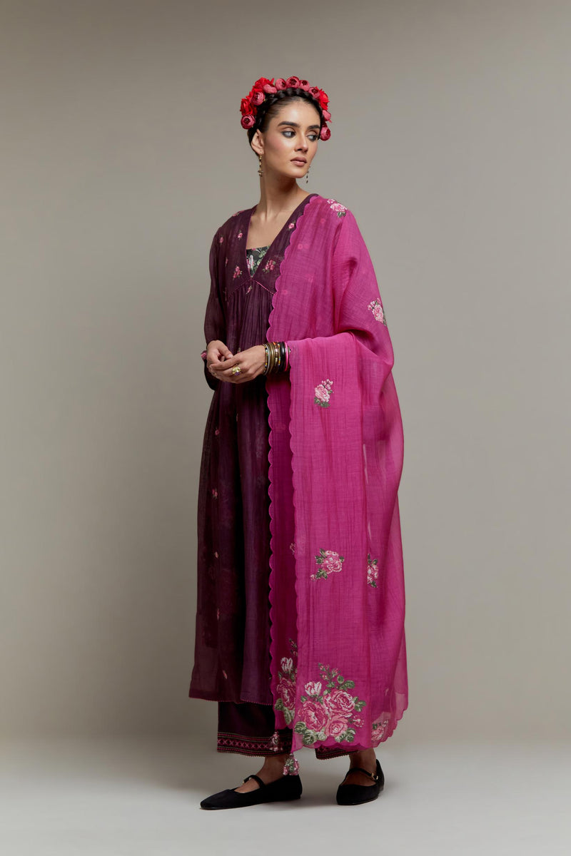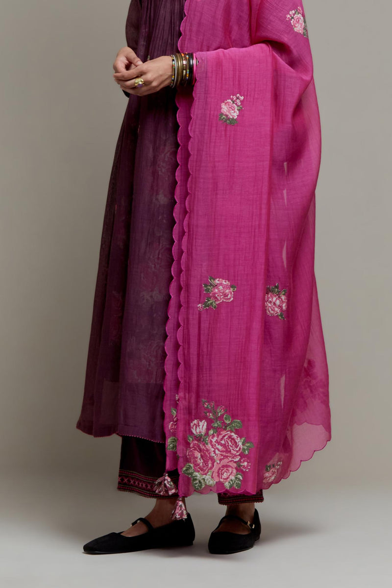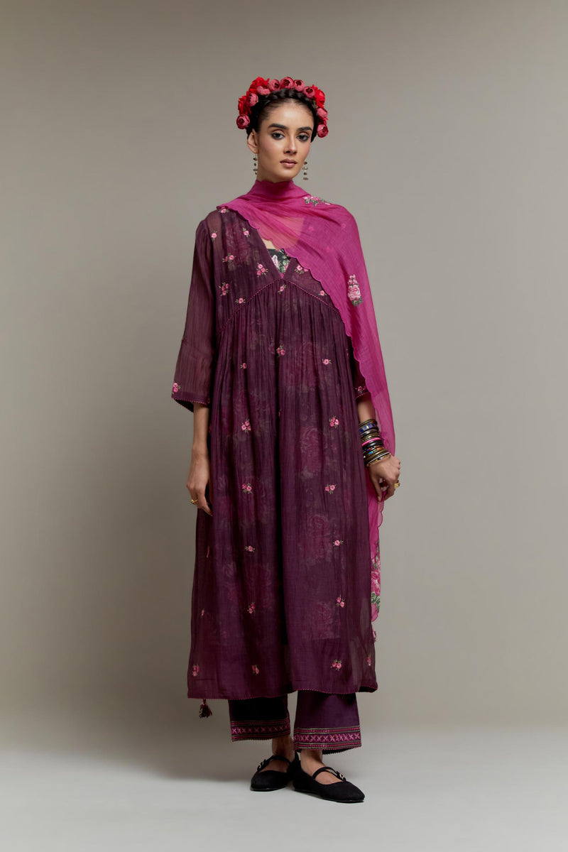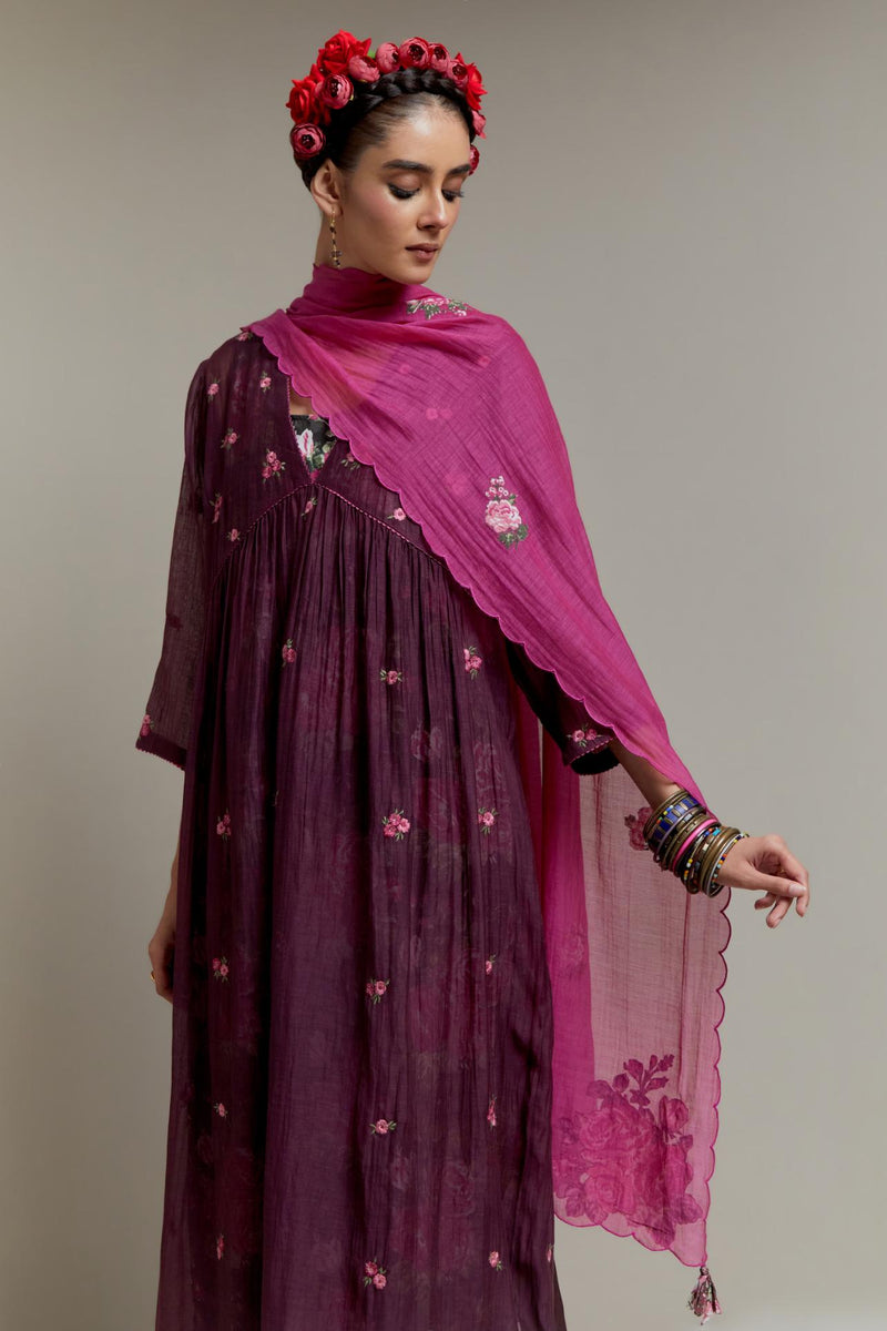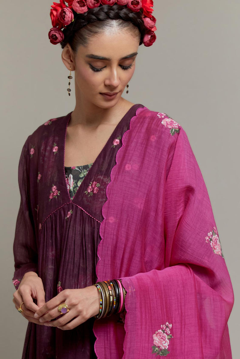 Dark Mauve Cotton Chanderi kurta dress with all-over Pink & Green small floral embroidery and floral hand block printed slip inside. It has V-neck and fine gathers at empire line & 3/4 sleeves. The edges of neck hem and sleeves are finished with contrast colored ricrac lace. Paired with Dark Mauve straight cotton pants with Pink & Green quilted embroidery at bottom hem. The waistband is elasticated at the back with drawstrings in the front for better fitting. It also has side pockets. Comes with Pink Cotton Chanderi dupatta with pink and green hand block printed applique, highlighted with scalloped edges. The corners are finished with fabric tassels.