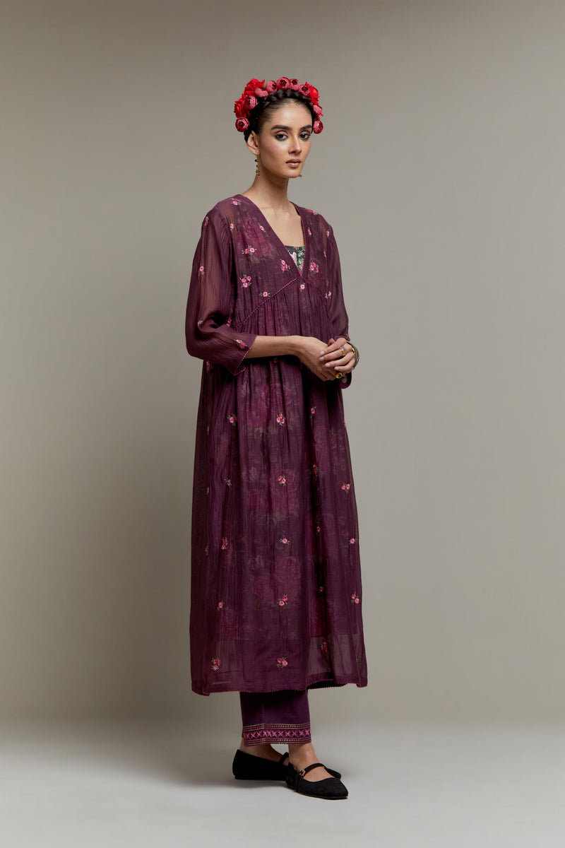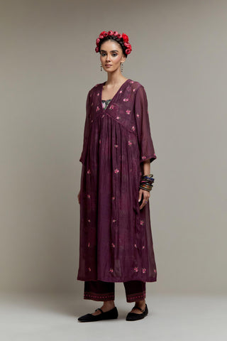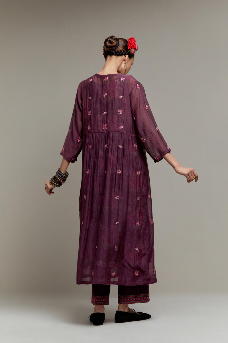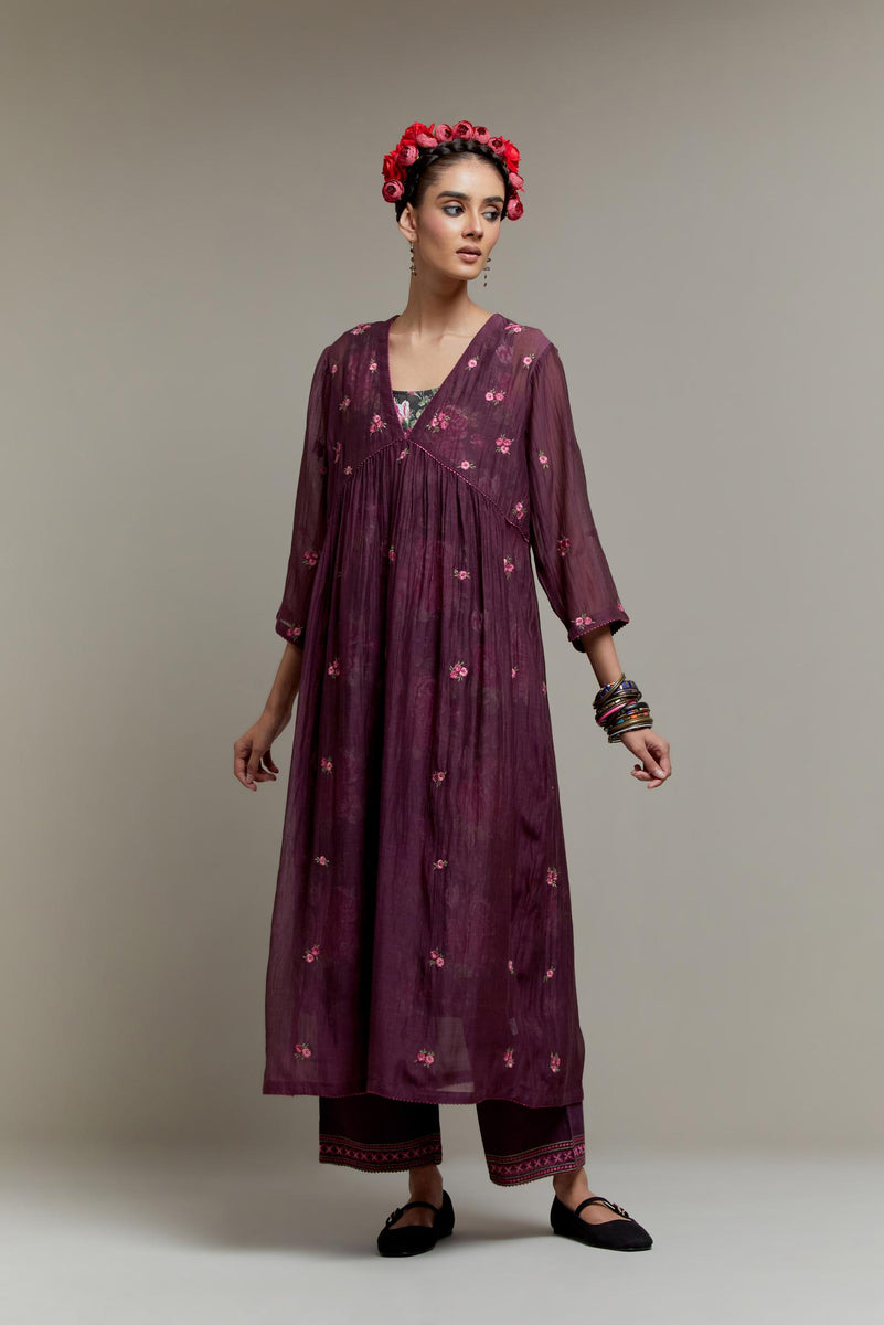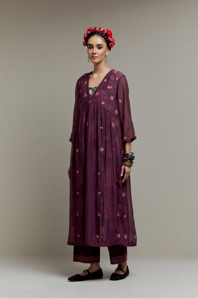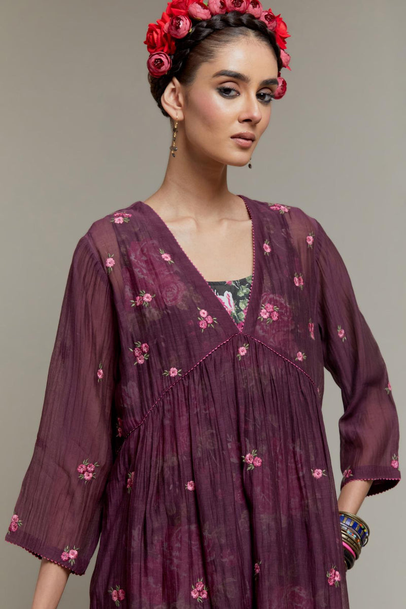 Dark Mauve Cotton Chanderi kurta dress with all-over Pink & Green small floral embroidery and floral hand block printed slip inside. It has V-neck and fine gathers at empire line & 3/4 sleeves. The edges of neck hem and sleeves are finished with contrast colored ricrac lace. Paired with Dark Mauve straight cotton pants with Pink & Green quilted embroidery at bottom hem. The waistband is elasticated at the back with drawstrings in the front for better fitting. It also has side pockets. Comes with Pink Cotton Chanderi dupatta with pink and green hand block printed applique, highlighted with scalloped edges. The corners are finished with fabric tassels.