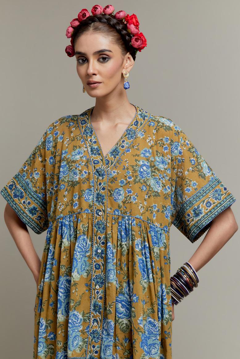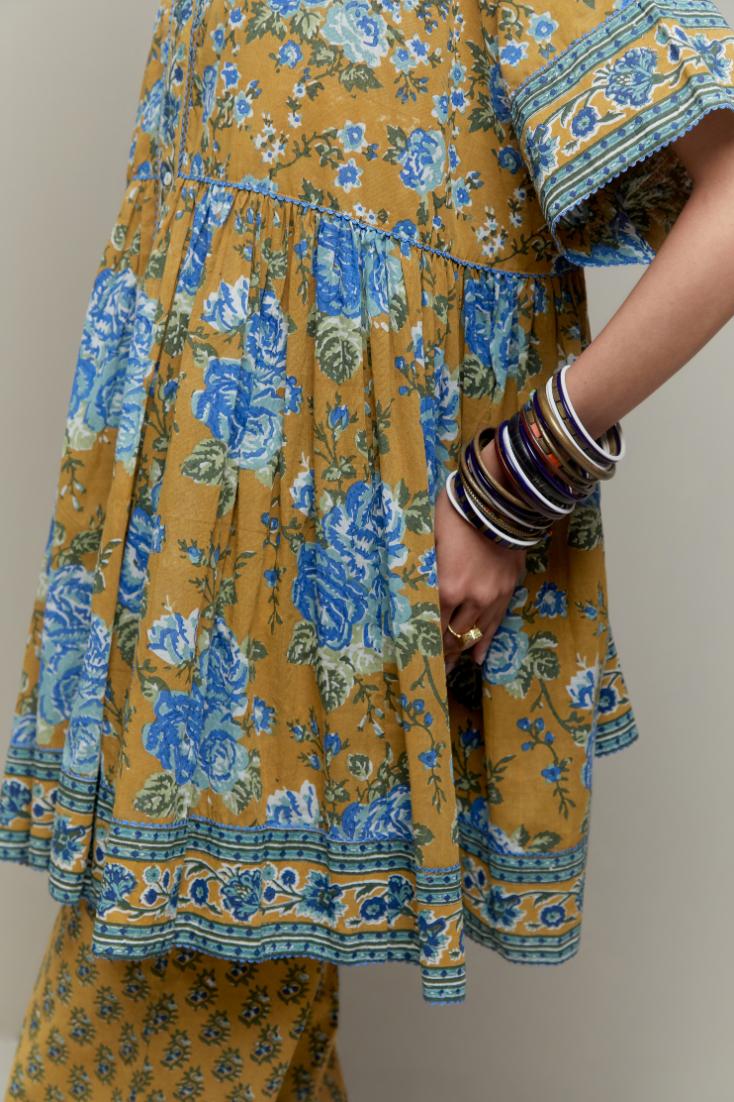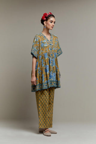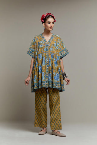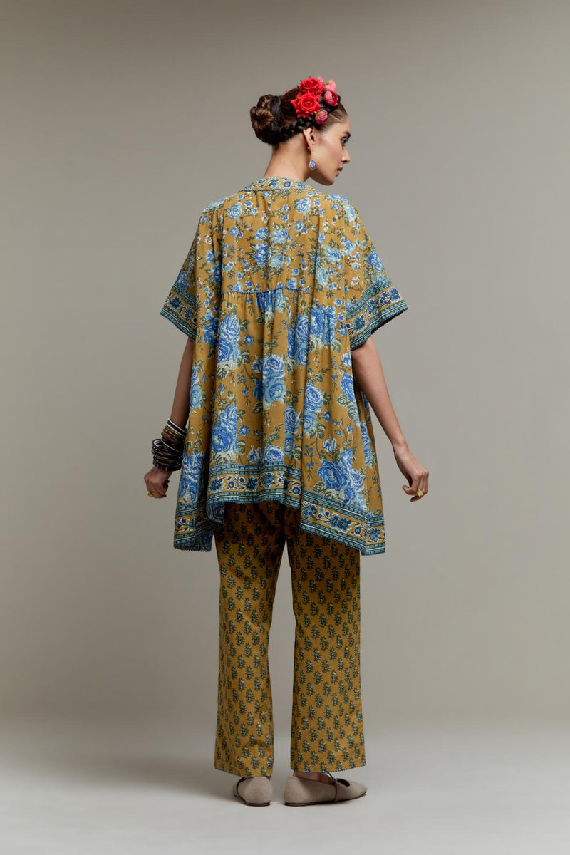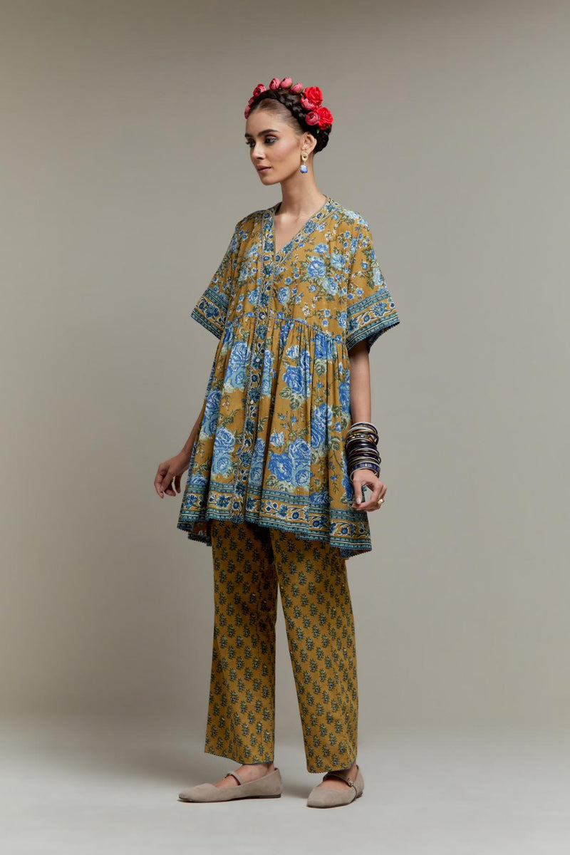 Dark olive Cotton hand block printed short top with all-over Blue & Green colored flower. It has a full front open placket neckline. The top is finished with contrast colored ricrac lace at the edges of neck placket, sleeves and hem. The top comes with fine cotton slip. Paired with Dark olive Cotton straight pants with all-over small flower hand block print. It has side pockets and an elasticated waist band with drawstrings in the front for a better fit.