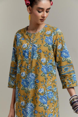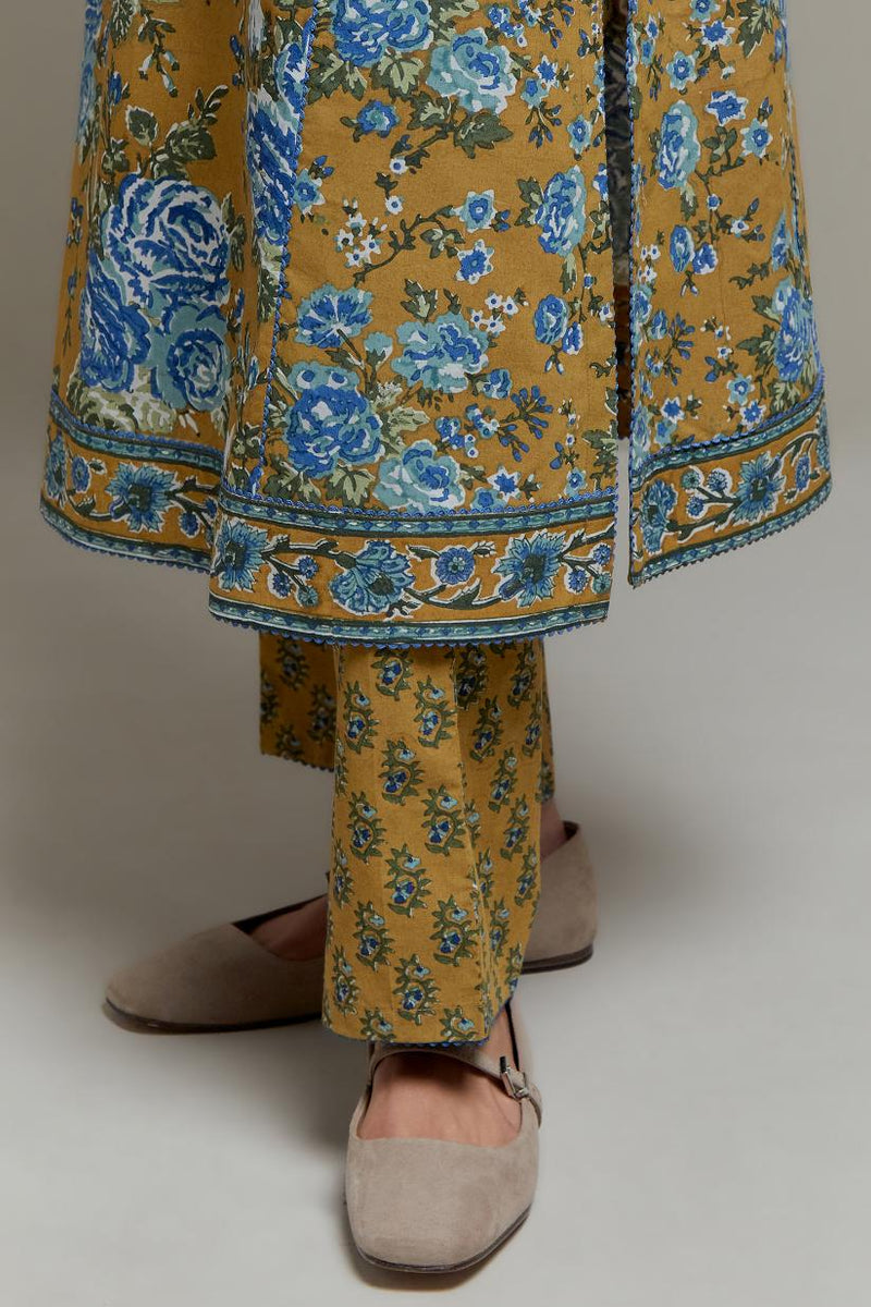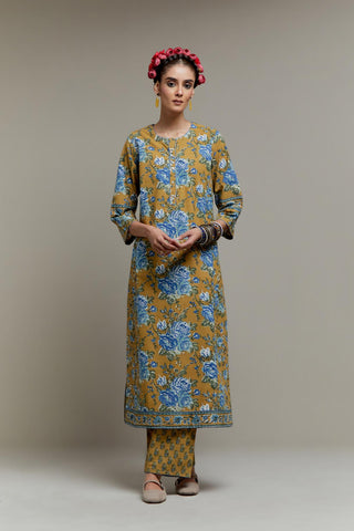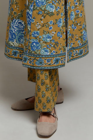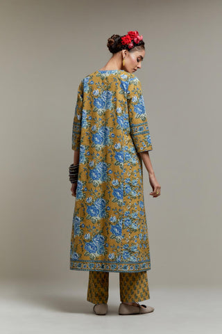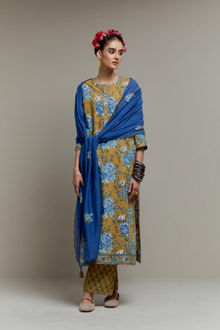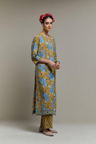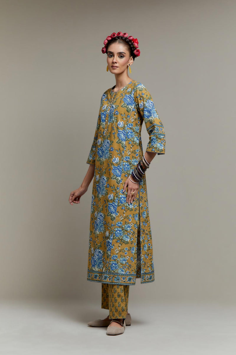 Dark olive cotton straight kurta set with all-over Blue & Green colored flower hand block print & and side panels. Sale