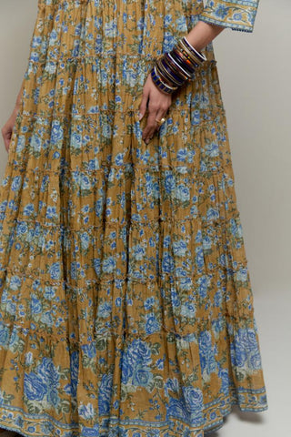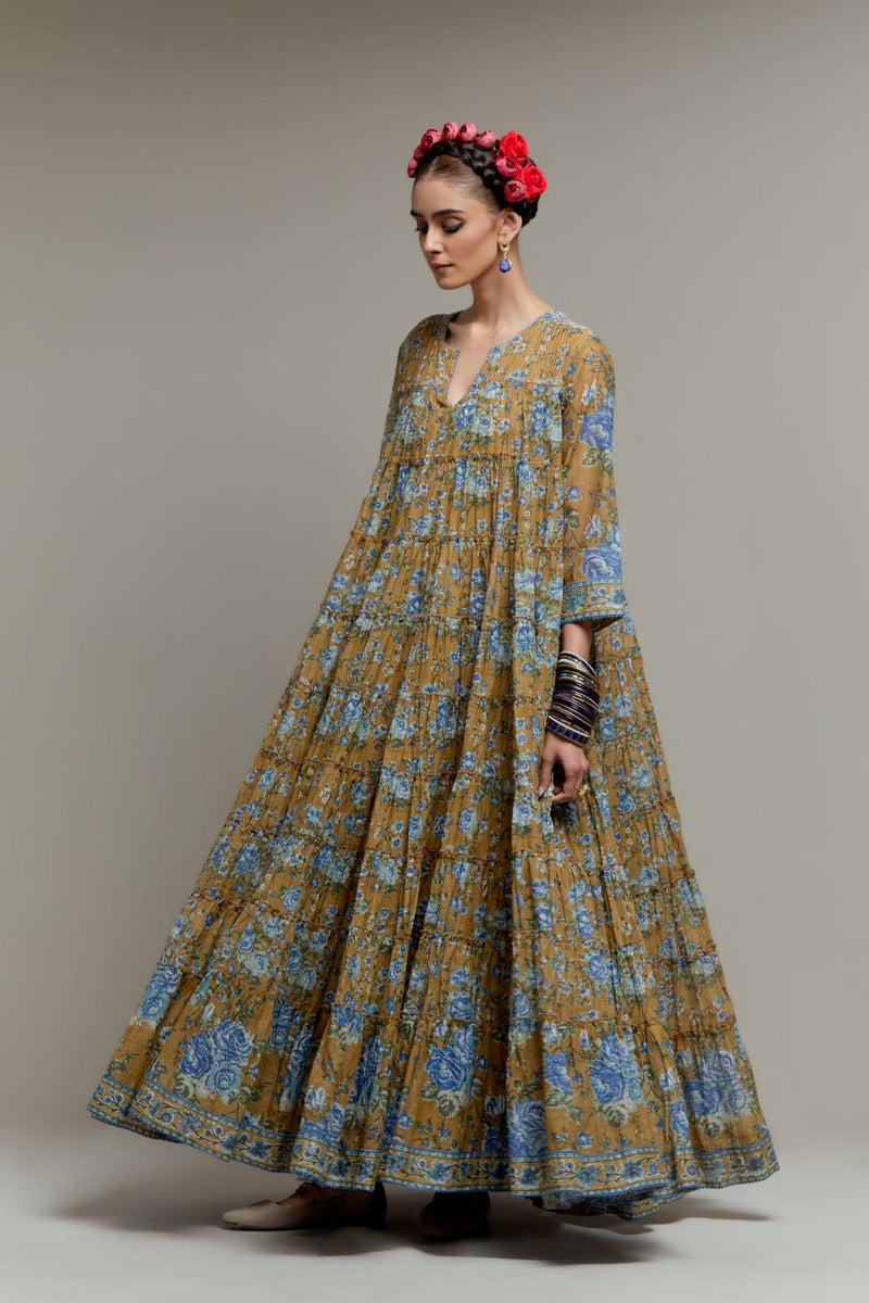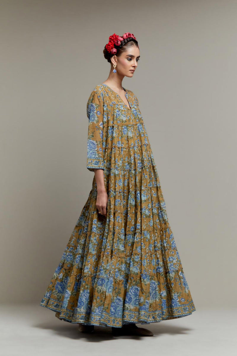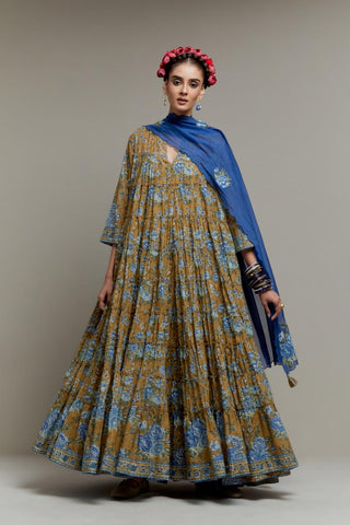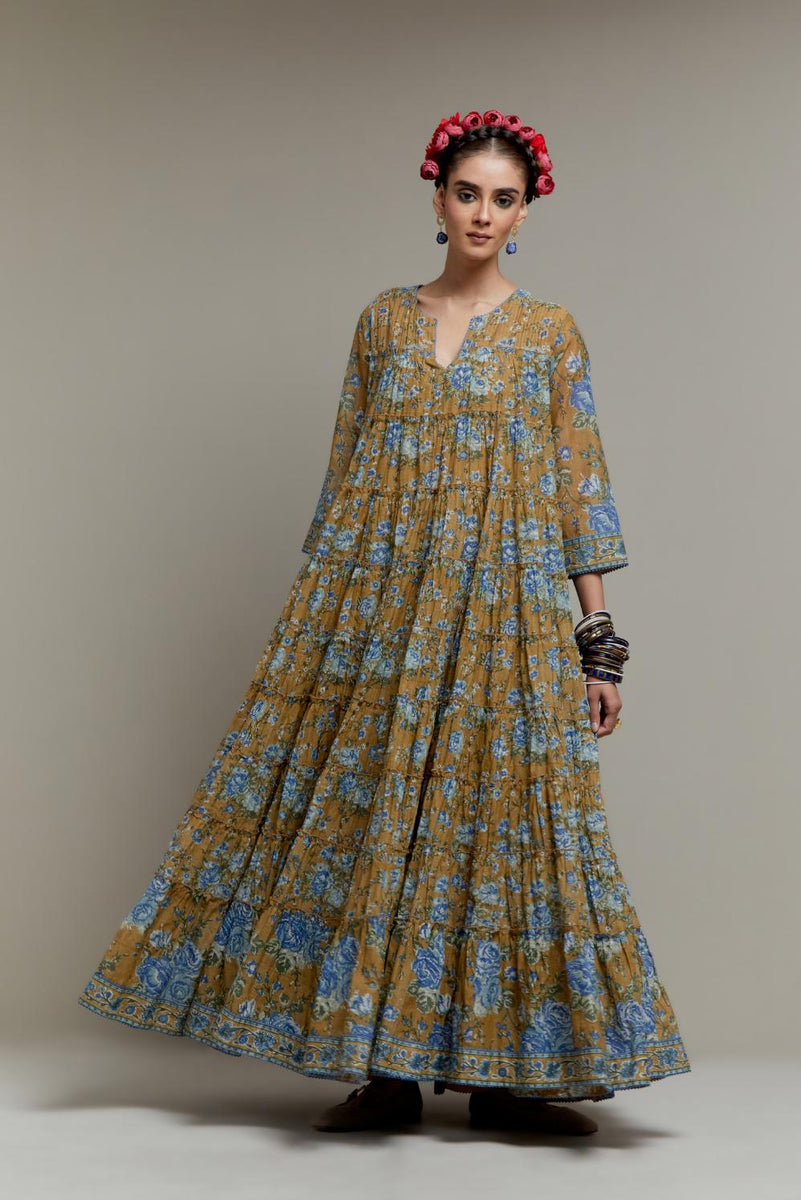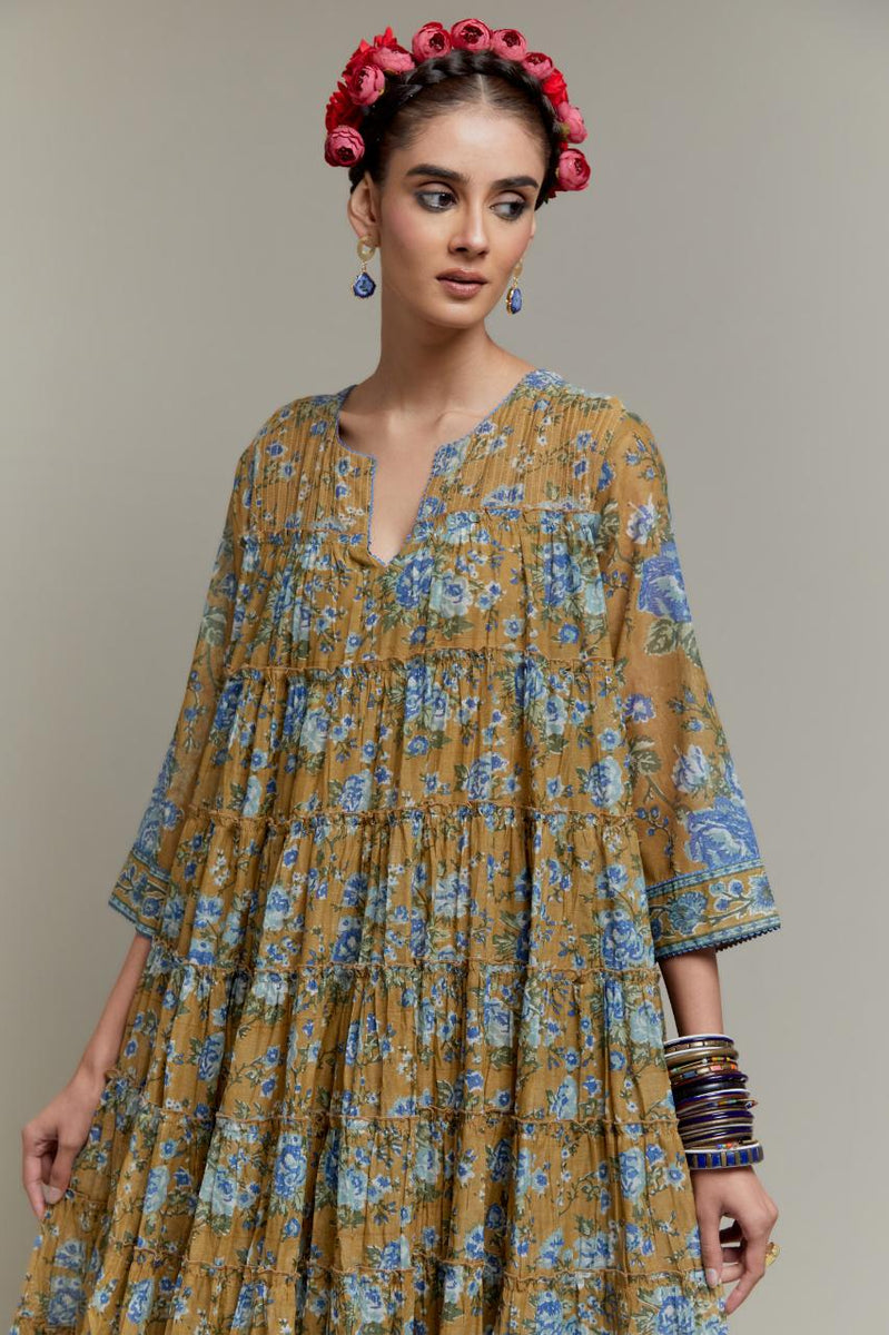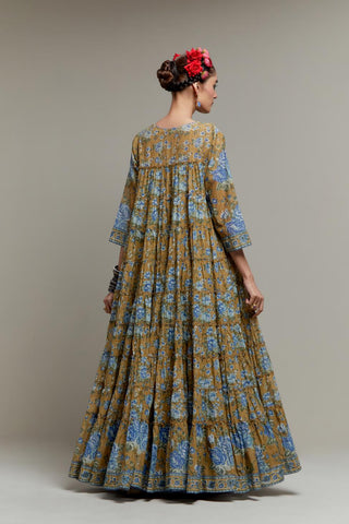 Dark olive hand block printed multi-tiered kurta dress with 3/4 sleeves, highlighted with quilted yoke in front and back. It has round neck and slit in the front & 3/4 sleeves. The kurta is finished with contrast colored ricrac lace at the edges of neck, sleeves and hem. The kurta comes with fine cotton slip. Paired with Olive straight pants with small floral booti embroidery at bottom hem. The waistband is elasticated at the back with drawstrings in the front for better fitting. It also has side pockets. Comes with Chelsea Blue Cotton Chanderi dupatta with blue and green hand block printed applique, highlighted with scalloped edges. The corners are finished with fabric tassels.