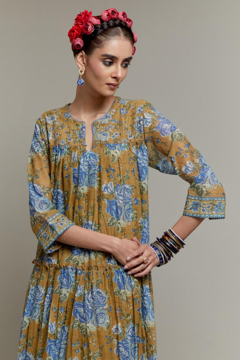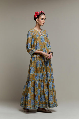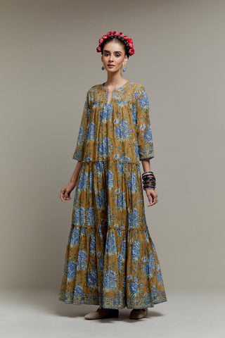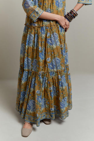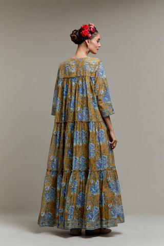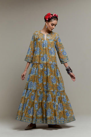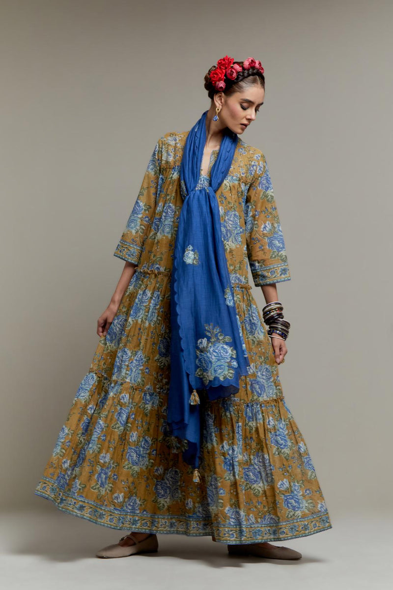 Dark olive Cotton Chanderi three-tiered kurta with quilted yoke and all-over Blue & Green floral hand block print. The edges of neck, sleeve and hem finished with contrast colored ricrac. It has a round neckline with a slit in the front and 3/4 sleeves. The kurta comes with fine cotton slip. Paired with Dark olive straight pants with small floral booti embroidery at bottom hem. The waistband is elasticated at the back with drawstrings in the front for better fitting. It also has side pockets. Comes with Chelsea Blue Cotton Chanderi dupatta with blue and green hand block printed applique, highlighted with scalloped edges. The corners are finished with fabric tassels.