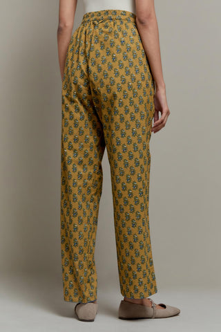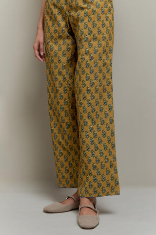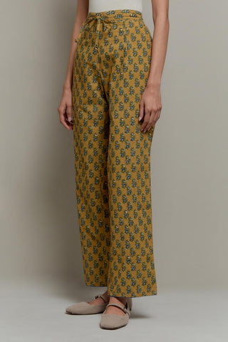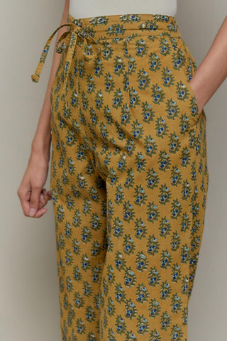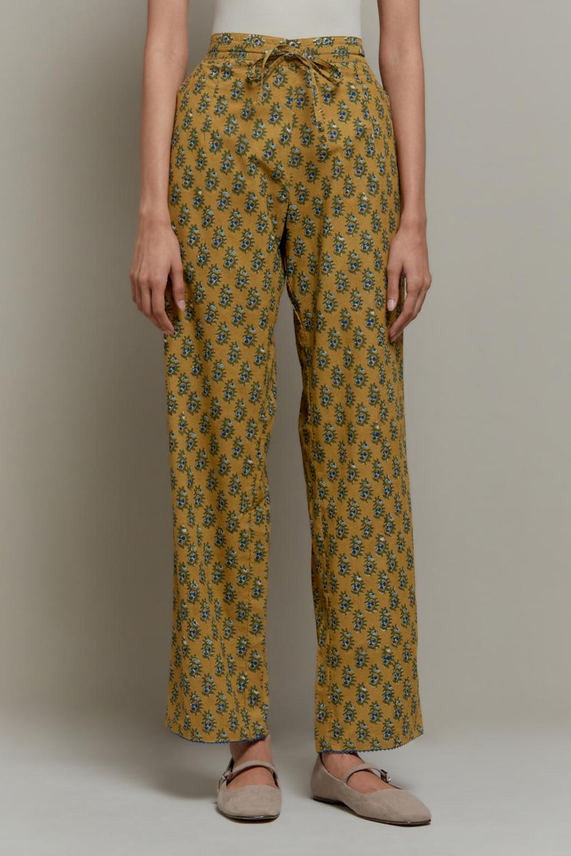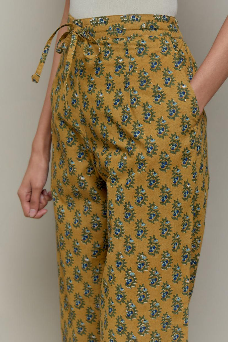 Olive Cotton straight pants with all-over small flower hand block print. It has side pockets and an elasticated waist band with drawstrings in the front for a better fit.