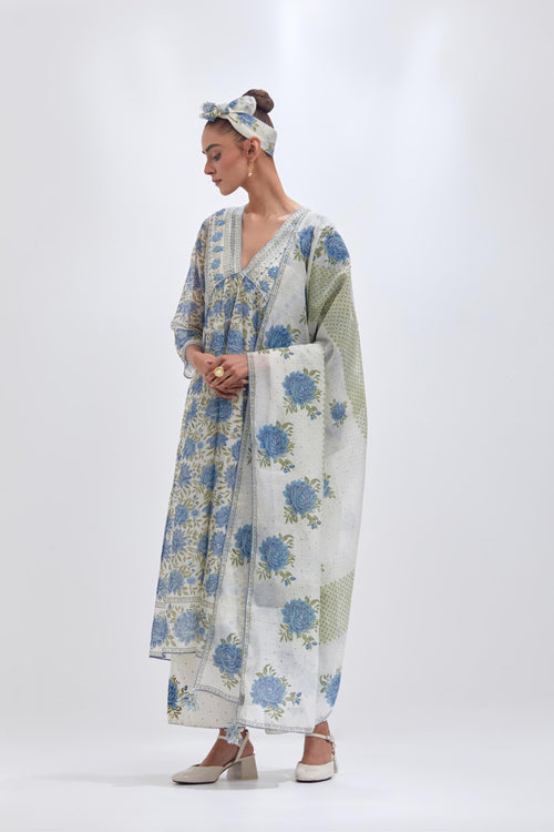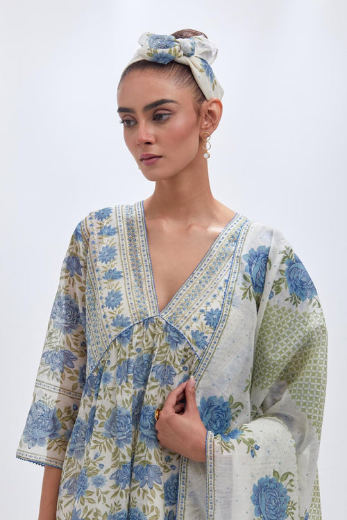Off white cotton chanderi dupatta with all-over blue & green hand block print.