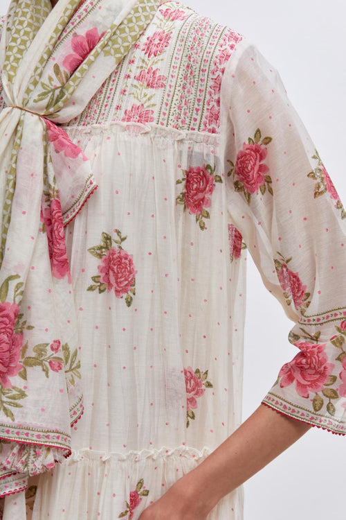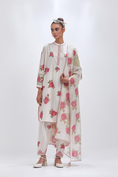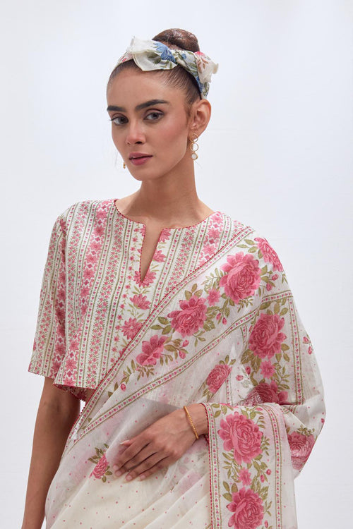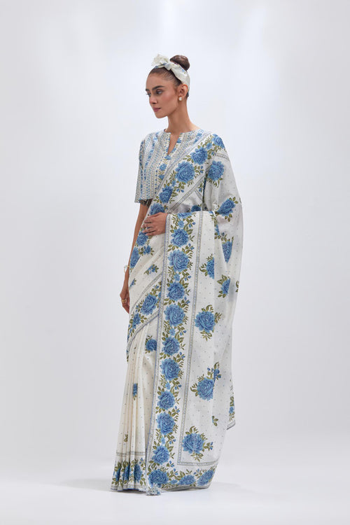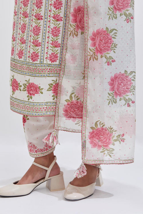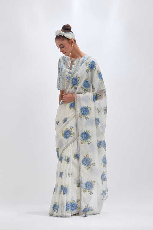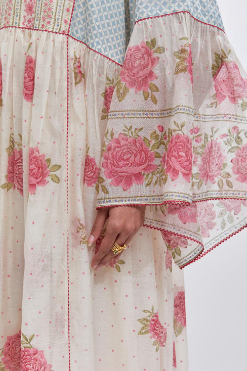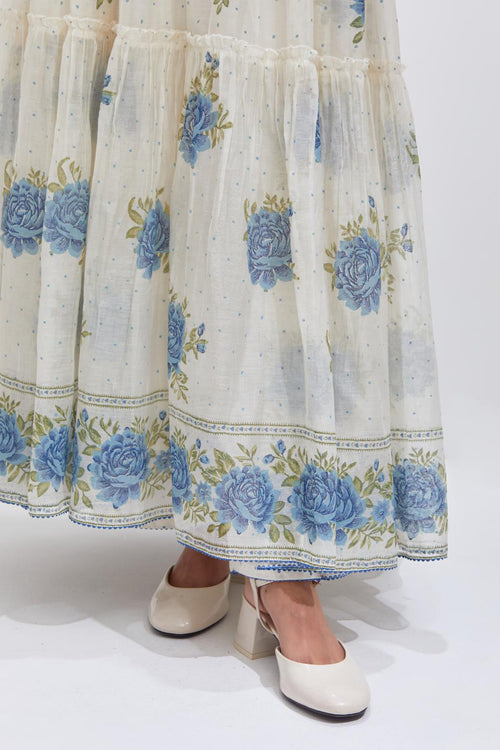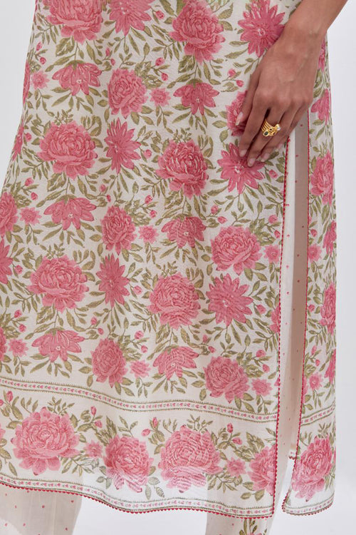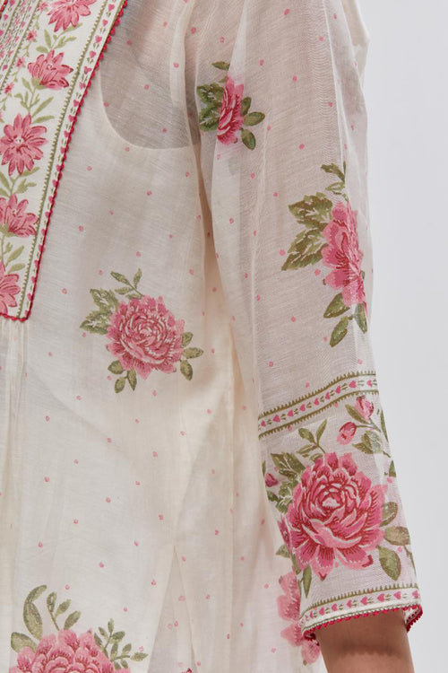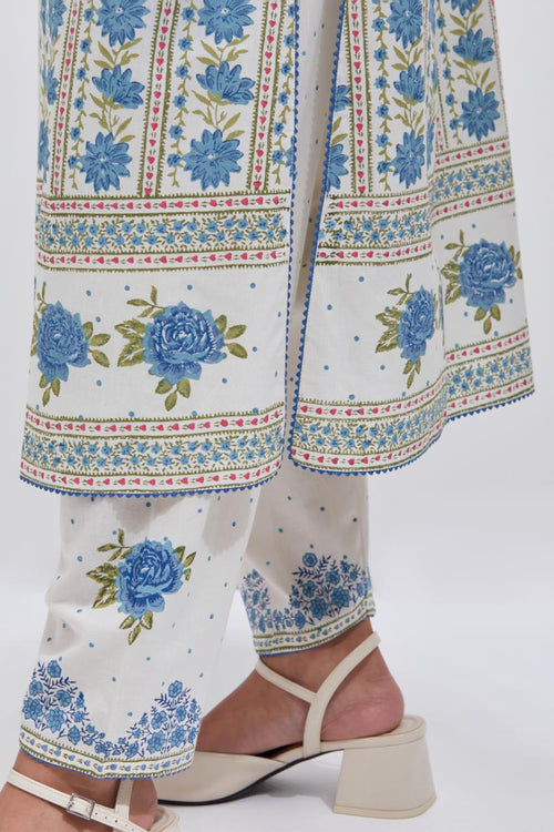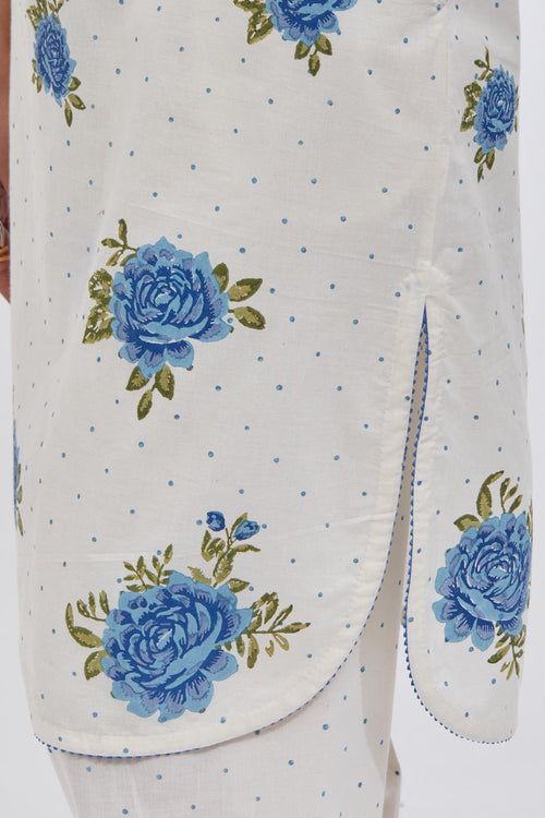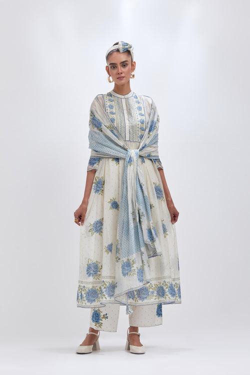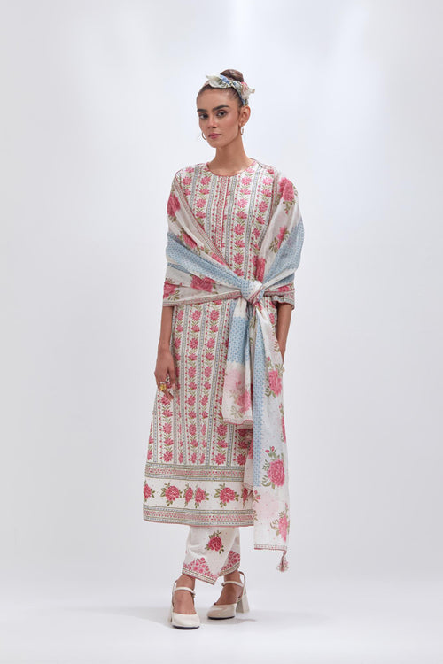 Off white cotton chanderi dupatta with all-over blue & pink hand block print.