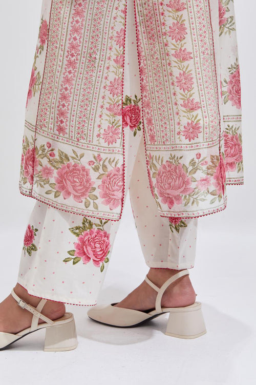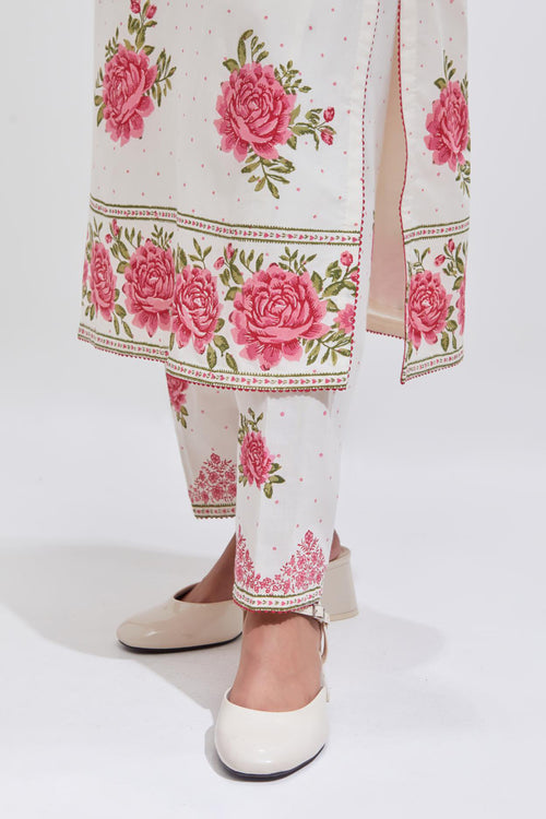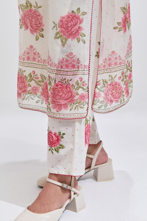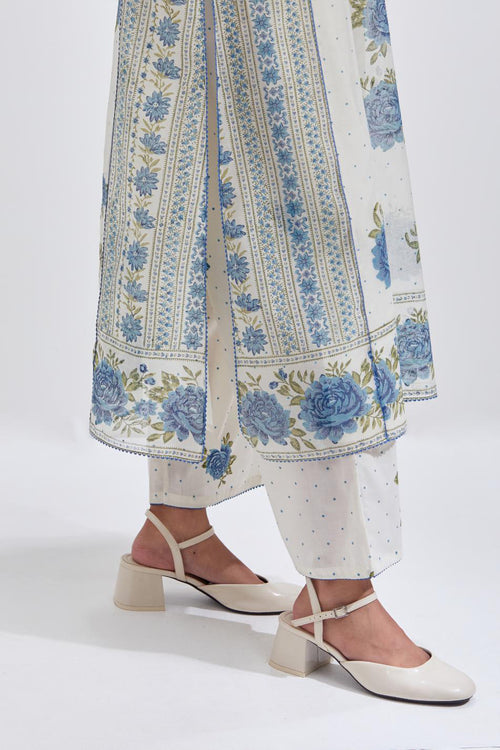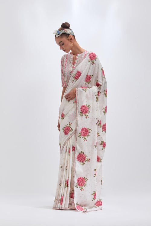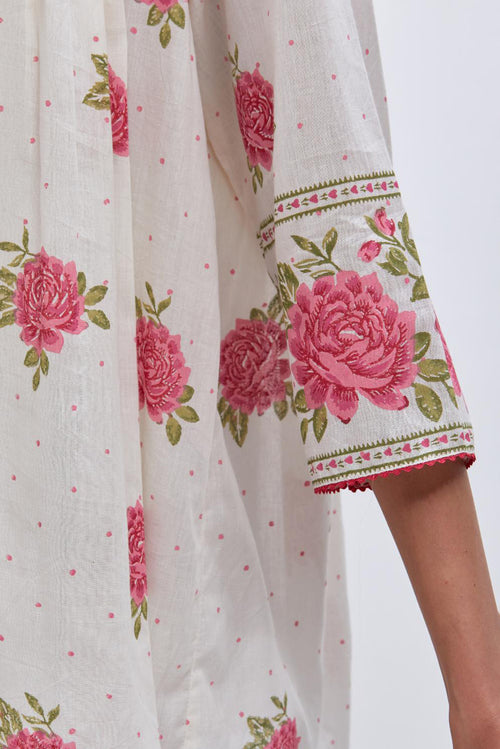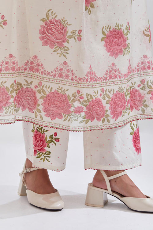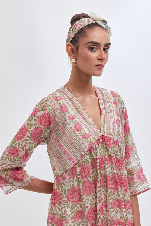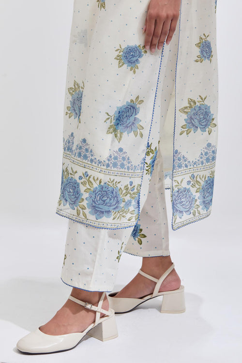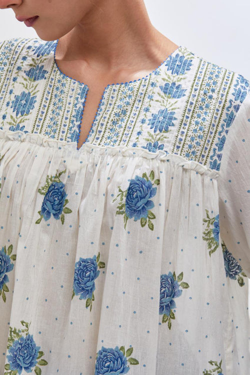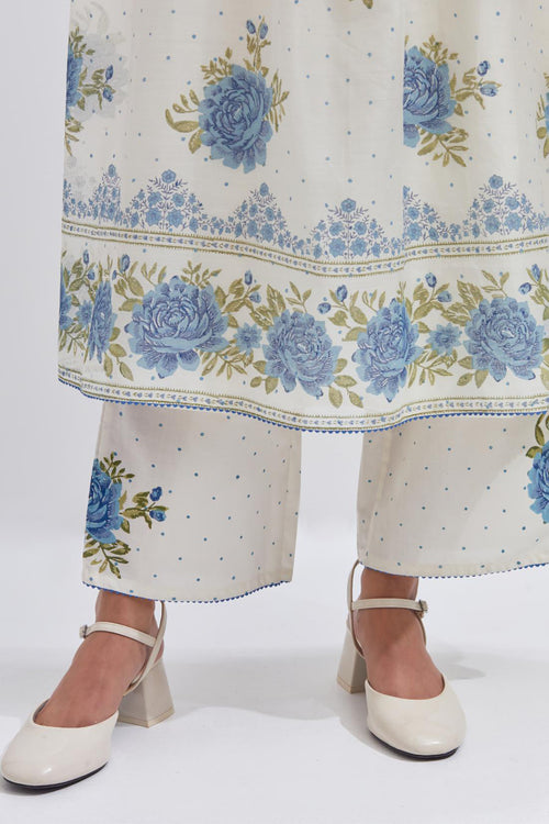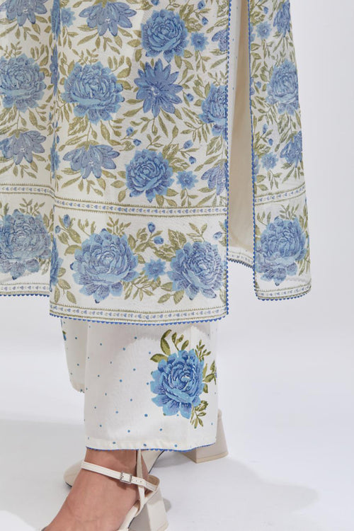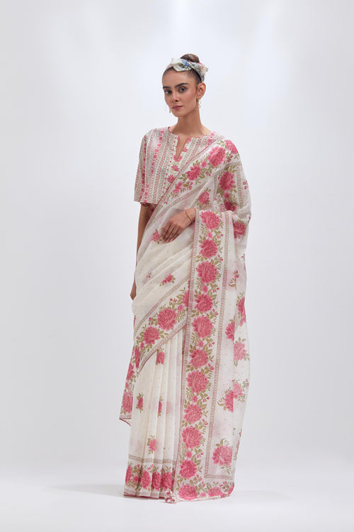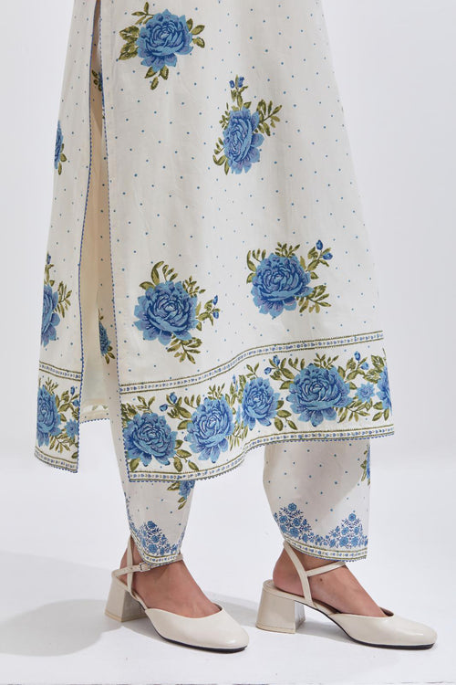 Off white cotton chanderi dupatta with all-over blue & pink hand block print.