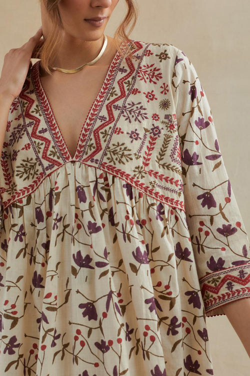 Beige cotton kurta dress set with all-over yellow & purple floral hand block print.
